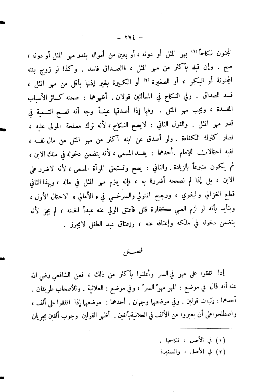 الْمَجْنُونِ نِكَاحًا بِمَهْرِ الْمِثْلِ أَوْ دُونَهُ، أَوْ بِعَيْنٍ مِنْ أَمْوَالِهِ بِقَدْرِ مَهْرِ الْمِثْلِ أَوْ دُونَهُ، صَحَّ. وَإِنْ قَبِلَهُ بِأَكْثَرِ مِنْ مَهْرِ الْمِثْلِ، فَالصَّدَاقُ فَاسِدٌ. وَكَذَا لَوْ زَوَّجَ بِنْتَهُ الْمَجْنُونَةَ أَوِ الْبِكْرَ، أَوِ الصَّغِيرَةَ أَوِ الْكَبِيرَةَ بِغَيْرِ إِذْنِهَا بِأَقَلَّ مِنْ مَهْرِ الْمِثْلِ، فَسَدَ الصَّدَاقُ. وَفِي النِّكَاحِ فِي الْمَسْأَلَتَيْنِ قَوْلَانِ: أَظْهَرُهُمَا: صِحَّتُهُ كَسَائِرِ الْأَسْبَابِ الْمُفْسِدَةِ، وَيَجِبُ مَهْرُ الْمِثْلِ. وَفِيمَا إِذَا أَصْدَقَهَا عَيْنًا وَجْهٌ أَنَّهُ تَصِحُّ التَّسْمِيَةُ فِي قَدْرِ مَهْرِ الْمِثْلِ.