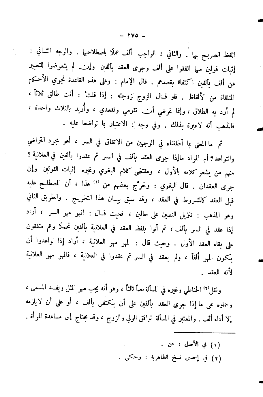 ثُمَّ مَا الْمَعْنَى بِمَا أَطْلَقْنَاهُ فِي الْوَجْهَيْنِ مِنْ الِاتِّفَاقِ فِي السِّرِّ، أَهْوَ مُجَرَّدُ التَّرَاضِي وَالتَّوَاعُدِ؟ أَمِ الْمُرَادُ مَا إِذَا جَرَى الْعَقْدُ بِأَلْفٍ فِي السِّرِّ ثُمَّ عَقَدُوا بِأَلْفَيْنِ فِي الْعَلَانِيَةِ؟ مِنْهُمْ مَنْ يُشْعِرُ كَلَامُهُ بِالْأَوَّلِ، وَمُقْتَضَى كَلَامِ الْبَغَوِيِّ وَغَيْرِهِ إِثْبَاتُ الْقَوْلَيْنِ وَإِنْ جَرَى الْعَقْدَانِ. قَالَ الْبَغَوِيُّ: وَخَرَجَ بَعْضُهُمْ مِنْ هَذَا، أَنَّ الْمُصْطَلَحَ عَلَيْهِ قَبْلَ الْعَقْدِ كَالْمَشْرُوطِ فِي الْعَقْدِ، وَقَدْ سَبَقَ بَيَانُ هَذَا التَّخْرِيجِ. وَالطَّرِيقُ الثَّانِي وَهُوَ الْمَذْهَبُ: تَنْزِيلُ النَّصَّيْنِ عَلَى حَالَيْنِ، فَحَيْثُ قَالَ: الْمَهْرُ مَهْرُ السِّرِّ، أَرَادَ إِذَا عَقَدَ فِي السِّرِّ بِأَلْفٍ، ثُمَّ أَتَوْا بِلَفْظِ الْعَقْدِ فِي الْعَلَانِيَةِ بِأَلْفَيْنِ تَحَمُّلًا وَهُمْ مُتَّفِقُونَ عَلَى بَقَاءِ الْعَقْدِ الْأَوَّلِ. وَحَيْثُ قَالَ: الْمَهْرُ مَهْرُ الْعَلَانِيَةِ، أَرَادَ إِذَا تَوَاعَدُوا أَنْ يَكُونَ الْمَهْرُ أَلْفًا، وَلَمْ يُعْقَدْ فِي السِّرِّ ثُمَّ عَقَدُوا فِي الْعَلَانِيَةِ، فَالْمَهْرُ مَهْرُ الْعَلَانِيَةِ لِأَنَّهُ الْعَقْدُ.