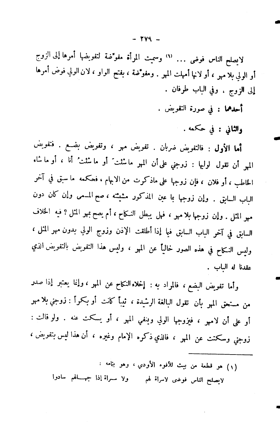 لَا يَصْلُحُ النَّاسُ فَوْضَى. . . وَسُمِّيَتِ الْمَرْأَةُ مُفَوِّضَةً لِتَفْوِيضِهَا أَمْرَهَا إِلَى الزَّوْجِ أَوِ الْوَلِيِّ بِلَا مَهْرٍ، أَوْ لِأَنَّهَا أَمْهَلَتِ الْمَهْرَ. وَمُفَوَّضَةٌ بِفَتْحِ الْوَاوِ ; لِأَنَّ الْوَلِيَّ فَوَّضَ أَمْرَهَا إِلَى الزَّوْجِ. وَفِي الْبَابِ طَرَفَانِ.