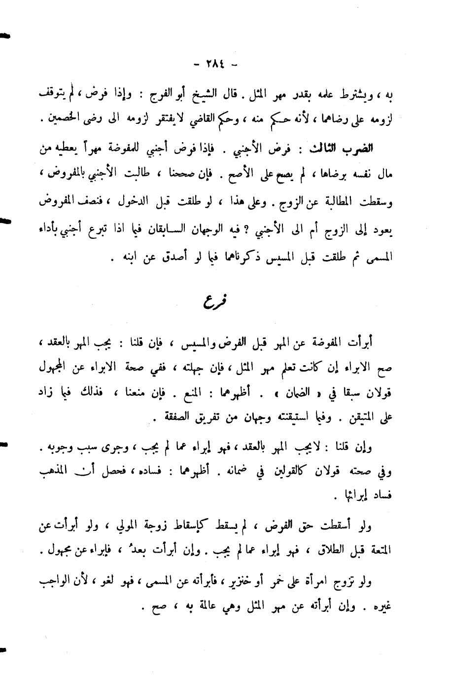 الضَّرْبُ الثَّالِثُ: فَرْضُ الْأَجْنَبِيِّ. فَإِذَا فَرَضَ أَجْنَبِيٌّ لِلْمُفَوِّضَةِ مَهْرًا يُعْطِيهِ مِنْ مَالِ نَفْسِهِ بِرِضَاهَا، لَمْ يَصِحَّ عَلَى الْأَصَحِّ. فَإِنْ صَحَّحْنَا، طَالَبَتِ الْأَجْنَبِيَّ بِالْمَفْرُوضِ، وَسَقَطَتِ الْمُطَالَبَةُ عَنِ الزَّوْجِ. وَعَلَى هَذَا، لَوْ طُلِّقَتْ قَبْلَ الدُّخُولِ، فَنَصِفُ الْمَفْرُوضِ يَعُودُ إِلَى الزَّوْجِ أَمْ إِلَى الْأَجْنَبِيِّ؟ فِيهِ الْوَجْهَانِ السَّابِقَانِ فِيمَا إِذَا تَبَرَّعَ أَجْنَبِيٌّ بِأَدَاءِ الْمُسَمَّى ثُمَّ طُلِّقَتْ قَبْلَ الْمَسِيسِ ذَكَرْنَاهُمَا فِيمَا لَوْ أَصْدَقَ عَنِ ابْنِهِ.
