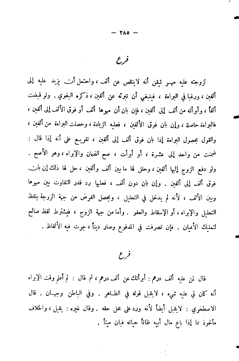 لِزَوْجَتِهِ عَلَيْهِ مَهْرٌ تَيَقَّنَ أَنَّهُ لَا يَنْقُصُ عَنْ أَلْفٍ، وَاحْتَمَلَ أَنْ يَزِيدَ عَلَيْهِ إِلَى أَلْفَيْنِ، وَرَغِبَا فِي الْبَرَاءَةِ، فَيَنْبَغِي أَنْ تُبَرِّئَهُ عَنْ أَلْفَيْنِ، ذَكَرَهُ الْبَغَوِيُّ. وَلَوْ قَبَضَتْ أَلْفًا، وَأَبْرَأَتْهُ مِنْ أَلْفٍ إِلَى أَلْفَيْنِ، فَإِنْ بَانَ أَنَّ مَهْرَهَا أَلْفٌ أَوْ فَوْقَ الْأَلْفِ إِلَى أَلْفَيْنِ، فَالْبَرَاءَةُ حَاصِلَةٌ، وَإِنْ بَانَ فَوْقَ الْأَلْفَيْنِ فَعَلَيْهِ الزِّيَادَةُ، وَحَصَلَتِ الْبَرَاءَةُ مِنْ أَلْفَيْنِ، وَالْقَوْلُ بِحُصُولِ الْبَرَاءَةِ إِذَا بَانَ فَوْقَ أَلْفٍ إِلَى أَلْفَيْنِ، تَفْرِيعٌ عَلَى أَنَّهُ إِذَا قَالَ: ضَمِنْتُ مِنْ وَاحِدٍ إِلَى عَشْرَةٍ، أَوْ أَبْرَأْتُ، صَحَّ الضَّمَانُ وَالْإِبْرَاءُ، وَهُوَ الْأَصَحُّ. وَلَوْ دَفَعَ الزَّوْجُ إِلَيْهَا أَلْفَيْنِ، وَحَلَّلَ لَهَا مَا بَيْنَ أَلْفٍ وَأَلْفَيْنِ، حَلَّ لَهَا ذَلِكَ إِنْ بَانَ فَوْقَ أَلْفٍ إِلَى أَلْفَيْنِ. وَإِنْ بَانَ دُونَ أَلْفٍ، فَعَلَيْهَا رَدُّ قَدْرِ التَّفَاوُتِ بَيْنَ مَهْرِهَا وَبَيْنَ الْأَلْفِ ; لِأَنَّهُ لَمْ يَدْخُلْ فِي التَّحْلِيلِ، وَيَحْصُلُ الْفَرْضُ مِنْ جِهَةِ الزَّوْجَةِ بِلَفْظِ التَّحْلِيلِ وَالْإِبْرَاءِ، أَوِ الْإِسْقَاطِ وَالْعَفْوِ. وَأَمَّا مِنْ جِهَةِ الزَّوْجِ، فَيُشْتَرَطُ لَفْظٌ صَالِحٌ لِتَمْلِيكِ الْأَعْيَانِ. فَإِنْ تَصَرَّفَتْ فِي الْمَدْفُوعِ وَصَارَ دَيْنًا، جَرَتْ فِيهِ الْأَلْفَاظُ.