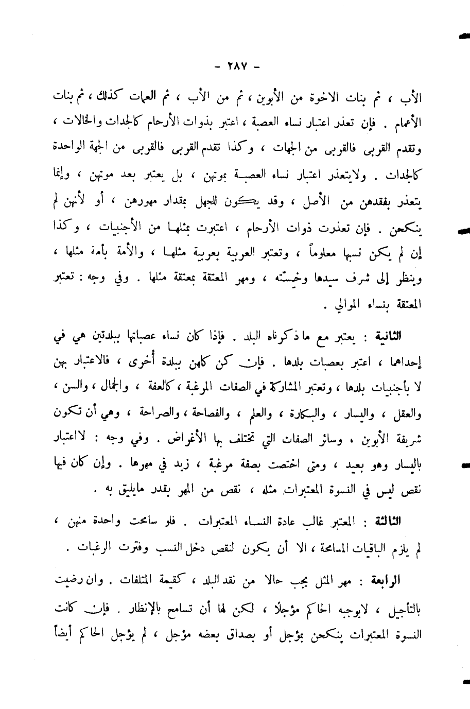 الْأَبِ، ثُمَّ بَنَاتُ الْإِخْوَةِ مِنَ الْأَبَوَيْنِ، ثُمَّ مِنَ الْأَبِ، ثُمَّ الْعَمَّاتُ كَذَلِكَ، ثُمَّ بَنَاتُ الْأَعْمَامِ. فَإِنْ تَعَذَّرَ اعْتِبَارُ نِسَاءِ الْعَصَبَةِ، اعْتُبِرَ بِذَوَاتِ الْأَرْحَامِ كَالْجَدَّاتِ وَالْخَالَاتِ، وَتُقَدَّمُ الْقُرْبَى فَالْقُرْبَى مِنَ الْجِهَاتِ، وَكَذَا تُقَدَّمَ الْقُرْبَى فَالْقُرْبَى مِنَ الْجِهَةِ الْوَاحِدَةِ كَالْجَدَّاتِ. وَلَا يَتَعَذَّرُ اعْتِبَارُ نِسَاءِ الْعَصَبَةِ بِمَوْتِهِنَّ، بَلْ يُعْتَبَرُ بَعْدَ مَوْتِهِنَّ، وَإِنَّمَا يَتَعَذَّرُ بِفَقْدِهِنَّ مِنَ الْأَصْلِ، وَقَدْ يَكُونُ لِلْجَهْلِ بِمِقْدَارِ مُهُورِهِنَّ، أَوْ لِأَنَّهُنَّ لَمْ يَنْكِحْنَ. فَإِنْ تَعَذَّرَتْ ذَوَاتُ الْأَرْحَامِ، اعْتُبِرَتْ بِمِثْلِهَا مِنَ الْأَجْنَبِيَّاتِ، وَكَذَا إِنْ لَمْ يَكُنْ نَسَبُهَا مَعْلُومًا، وَتُعْتَبَرُ الْعَرَبِيَّةُ بِعَرَبِيَّةٍ مِثْلِهَا، وَالْأَمَةُ بِأَمَةٍ مِثْلِهَا، وَيُنْظَرُ إِلَى شَرَفِ سَيِّدِهَا وَخِسَّتِهِ، وَمَهْرُ الْمُعَتَقَةِ بِمُعَتَقَةٍ مِثْلِهَا. وَفِي وَجْهٍ: تُعْتَبَرُ الْمُعَتَقَةُ بِنِسَاءِ الْمَوَالِي.