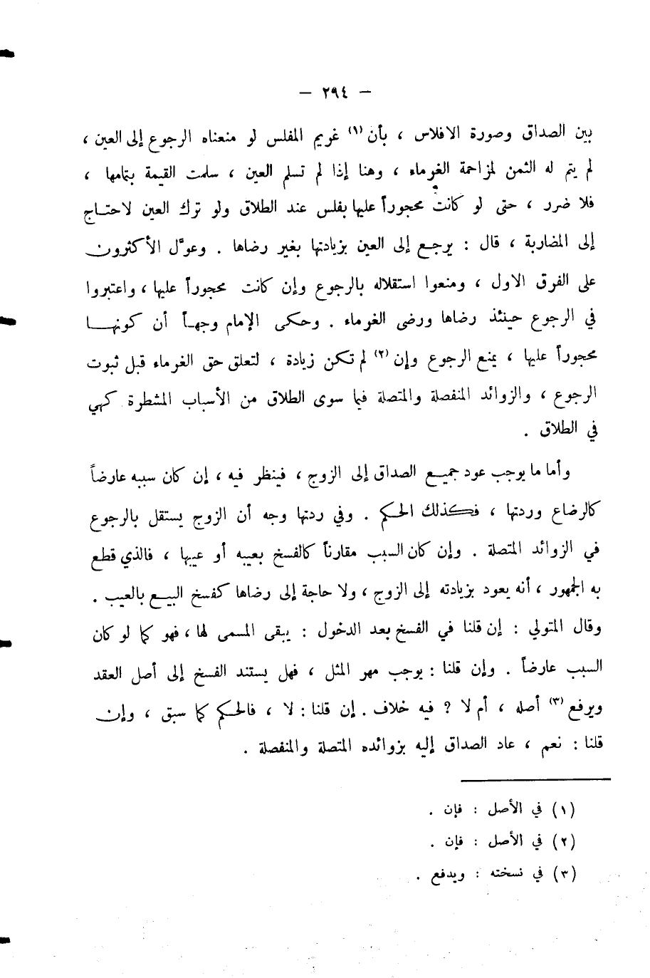 بَيْنَ الصَّدَاقِ وَصُورَةِ الْإِفْلَاسِ، بِأَنَّ غَرِيمَ الْمُفْلِسِ لَوْ مَنَعْنَاهُ الرُّجُوعَ إِلَى الْعَيْنِ، لَمْ يَتِمَّ لَهُ الثَّمَنُ لِمُزَاحَمَةِ الْغُرَمَاءِ، وَهُنَا إِذَا لَمْ تُسَلِّمِ الْعَيْنَ، سَلَّمَتِ الْقِيمَةَ بِتَمَامِهَا، فَلَا ضَرَرَ، حَتَّى لَوْ كَانَتْ مَحْجُورًا عَلَيْهَا بِفَلَسٍ عِنْدَ الطَّلَاقِ وَلَوْ تَرَكَ الْعَيْنَ لَاحْتَاجَ إِلَى الْمُضَارَبَةِ، قَالَ: يَرْجِعُ إِلَى الْعَيْنِ بِزِيَادَتِهَا بِغَيْرِ رِضَاهَا. وَعَوَّلَ الْأَكْثَرُونَ عَلَى الْفَرْقِ الْأَوَّلِ، وَمَنَعُوا اسْتِقْلَالَهُ بِالرُّجُوعِ وَإِنْ كَانَتْ مَحْجُورًا عَلَيْهَا، وَاعْتَبَرُوا فِي الرُّجُوعِ حِينَئِذٍ رِضَاهَا وَرِضَى الْغُرَمَاءِ. وَحَكَى الْإِمَامُ وَجْهًا أَنَّ كَوْنَهَا مَحْجُورًا عَلَيْهَا، يَمْنَعُ الرُّجُوعَ وَإِنْ لَمْ تَكُنْ زِيَادَةً، لِتَعَلُّقِ حَقِّ الْغُرَمَاءِ قَبْلَ ثُبُوتِ الرُّجُوعِ، وَالزَّوَائِدُ الْمُنْفَصِلَةُ وَالْمُتَّصِلَةُ فِيمَا سِوَى الطَّلَاقِ مِنَ الْأَسْبَابِ الْمُشَطِّرَةِ كَهِيَ فِي الطَّلَاقِ.