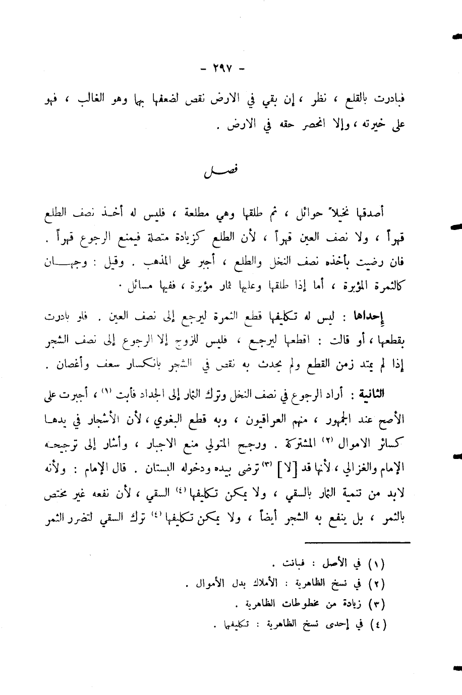 إِحْدَاهَا: لَيْسَ لَهُ تَكْلِيفُهَا قَطْعَ الثَّمَرَةِ لِيَرْجِعَ إِلَى نِصْفِ الْعَيْنِ. فَلَوْ بَادَرَتْ بِقَطْعِهَا، أَوْ قَالَتْ: اقْطَعْهَا لِيَرْجِعَ، فَلَيْسَ لِلزَّوْجِ إِلَّا الرُّجُوعُ إِلَى نِصْفِ الشَّجَرِ إِذَا لَمْ يَمْتَدَّ زَمَنُ الْقَطْعِ وَلَمْ يَحْدُثْ بِهِ نَقْصٌ فِي الشَّجَرِ بِانْكِسَارِ سَعَفٍ وَأَغْصَانٍ.