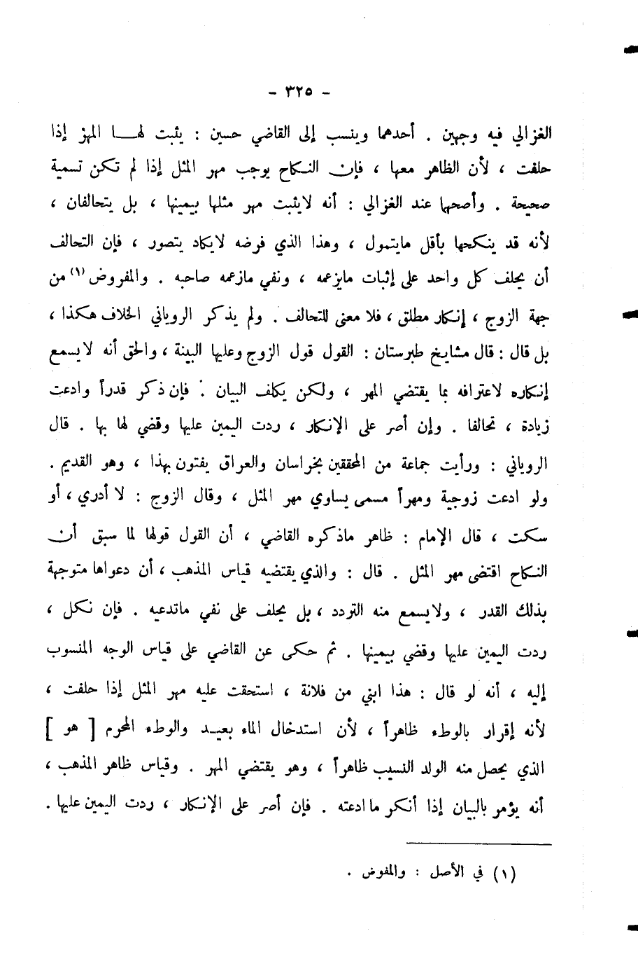 الْغَزَالِيُّ فِيهِ وَجْهَيْنِ. أَحَدُهُمَا وَيُنْسَبُ إِلَى الْقَاضِي حُسَيْنٍ: يَثْبُتُ لَهَا الْمَهْرُ إِذَا حَلَفَتْ؛ لِأَنَّ الظَّاهِرَ مَعَهَا، فَإِنَّ النِّكَاحَ يُوجِبُ مَهْرَ الْمِثْلِ إِذَا لَمْ تَكُنْ تَسْمِيَةٌ صَحِيحَةٌ. وَأَصَحُّهُمَا عِنْدَ الْغَزَالِيِّ: أَنَّهُ لَا يَثْبُتُ مَهْرُ مِثْلِهَا بِيَمِينِهَا، بَلْ يَتَحَالَفَانِ؛ لِأَنَّهُ قَدْ يَنْكِحُهَا بِأَقَلِّ مَا يُتَمَوَّلُ، وَهَذَا الَّذِي فَرَضَهُ لَا يَكَادُ يُتَصَوَّرُ، فَإِنَّ التَّحَالُفَ أَنْ يَحْلِفَ كُلُّ وَاحِدٍ عَلَى إِثْبَاتِ مَا يَزْعُمُهُ، وَنَفْيِ مَا زَعَمَهُ صَاحِبُهُ.
