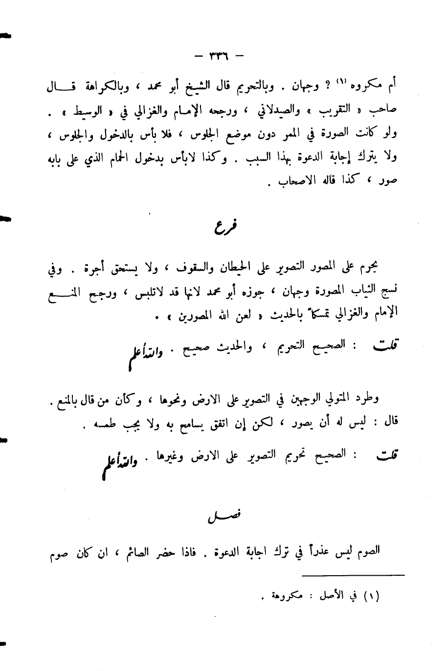 وَبِالتَّحْرِيمِ قَالَ الشَّيْخُ أَبُو مُحَمَّدٍ، وَبِالْكَرَاهَةِ قَالَ صَاحِبُ «التَّقْرِيبِ» وَالصَّيْدَلَانِيُّ، وَرَجَّحَهُ الْإِمَامُ وَالْغَزَالِيُّ فِي «الْوَسِيطِ» . وَلَوْ كَانَتِ الصُّورَةُ فِي الْمَمَرِّ دُونَ مَوْضِعِ الْجُلُوسِ، فَلَا بَأْسَ بِالدُّخُولِ وَالْجُلُوسِ، وَلَا يَتْرُكُ إِجَابَةَ الدَّعْوَةِ بِهَذَا السَّبَبِ.