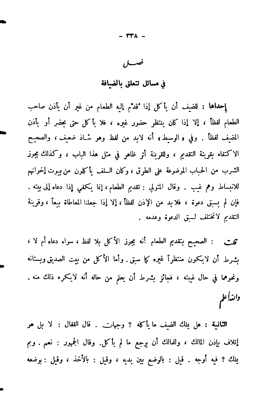 إِحْدَاهَا: لِلضَّيْفِ أَنْ يَأْكُلَ إِذَا قُدِّمَ إِلَيْهِ الطَّعَامُ مِنْ غَيْرِ أَنْ يَأْذَنَ صَاحِبُ الطَّعَامِ لَفْظًا، إِلَّا إِذَا كَانَ يَنْتَظِرُ حُضُورَ غَيْرِهِ، فَلَا يَأْكُلْ حَتَّى يَحْضُرَ أَوْ يَأْذَنَ الْمُضِيفُ لَفْظًا.