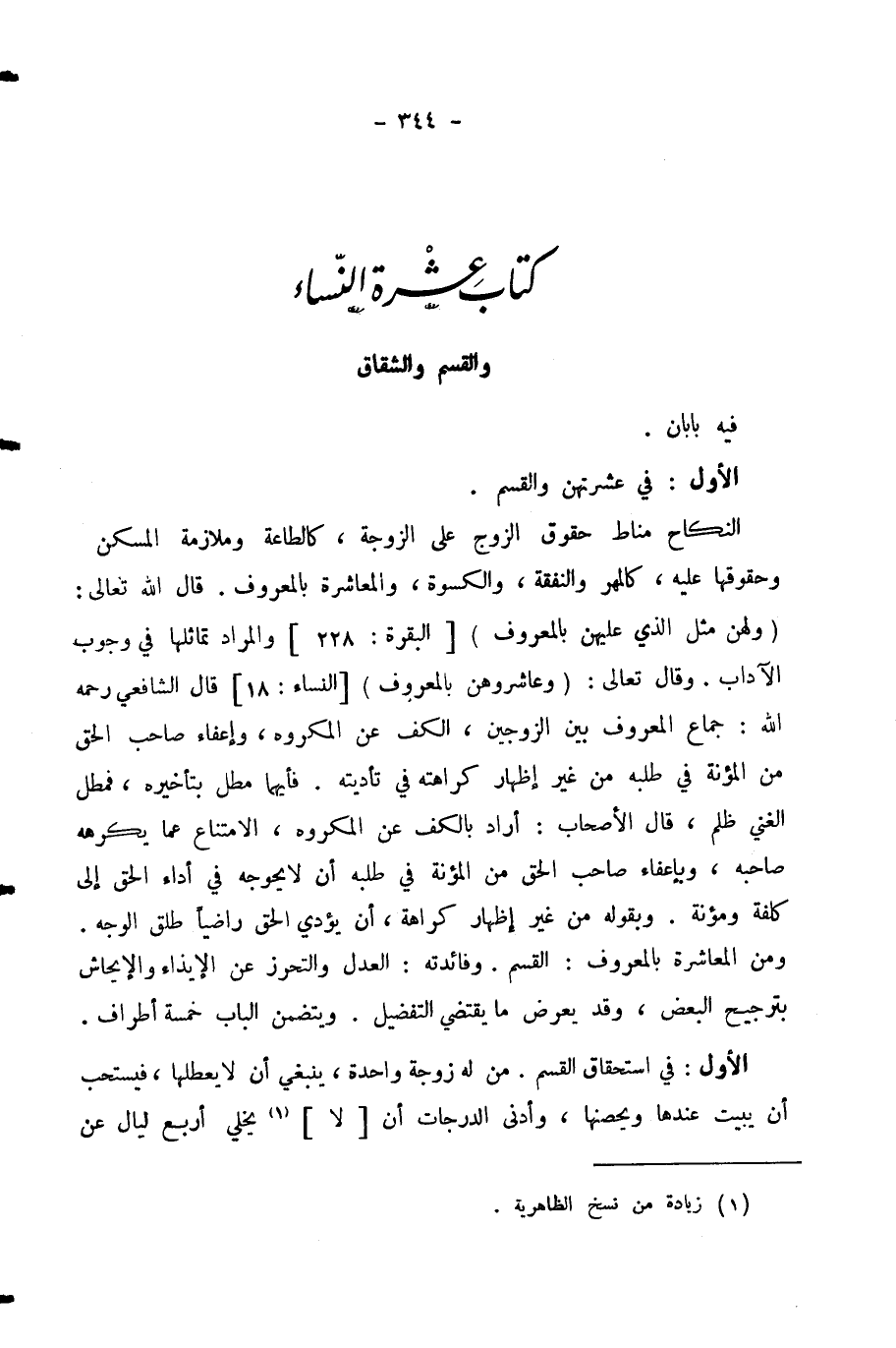 الْأَوَّلُ: فِي عِشْرَتِهِنَّ وَالْقَسْمِ.