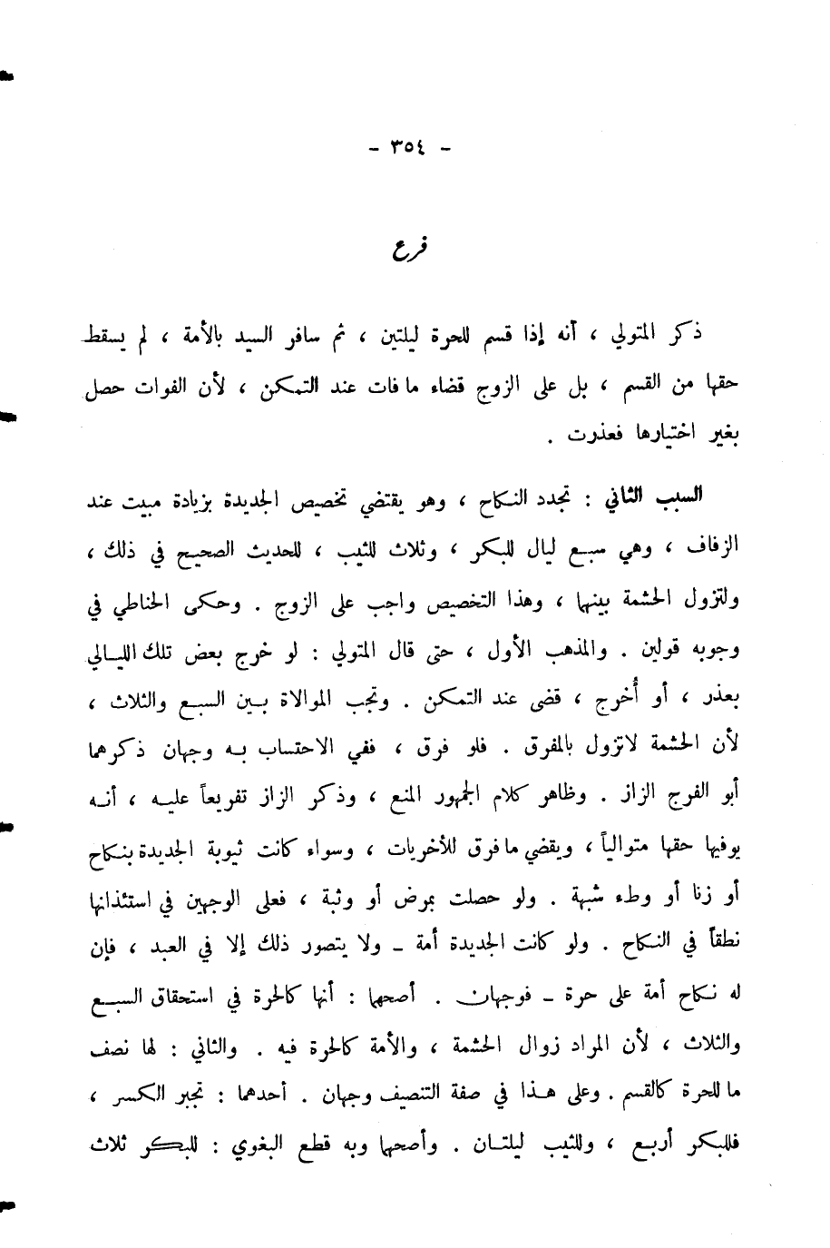 السَّبَبُ الثَّانِي: تَجَدُّدُ النِّكَاحِ، وَهُوَ يَقْتَضِي تَخْصِيصَ الْجَدِيدَةِ بِزِيَادَةِ مَبِيتٍ عِنْدَ الزِّفَافِ، وَهِيَ سَبْعُ لَيَالٍ لِلْبِكْرِ، وَثَلَاثٌ لِلثَّيِّبِ، لِلْحَدِيثِ الصَّحِيحِ فِي ذَلِكَ، وَلِتَزُولَ الْحِشْمَةُ بَيْنَهُمَا، وَهَذَا التَّخْصِيصُ وَاجِبٌ عَلَى الزَّوْجِ.