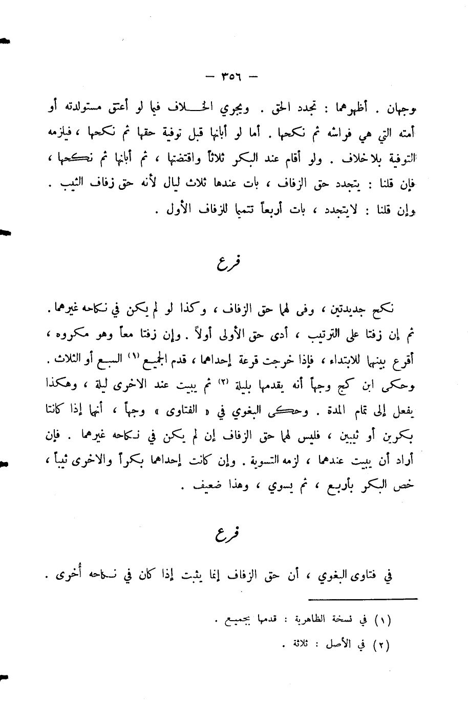 فِي فَتَاوَى الْبَغَوِيِّ، أَنَّ حَقَّ الزِّفَافِ إِنَّمَا يَثْبُتُ إِذَا كَانَ فِي نِكَاحِهِ أُخْرَى.