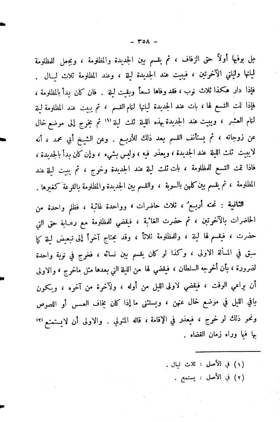 فَإِذَا دَارَ هَكَذَا ثَلَاثَ نُوَبٍ، فَقَدْ وَفَّاهَا تِسْعًا وَبَقِيَتْ لَيْلَةٌ. فَإِنْ كَانَ بَدَأَ بِالْمَظْلُومَةِ، فَإِذَا تَمَّتِ التِّسْعُ لَهَا، بَاتَ عِنْدَ الْجَدِيدَةِ لَيْلَتَهَا لِتَمَامِ الْقَسْمِ، ثُمَّ يَبِيتُ عِنْدَ الْمَظْلُومَةِ لَيْلَةً لِتَمَامِ الْعَشْرِ، وَيَبِيتُ عِنْدَ الْجَدِيدَةِ بِهَذِهِ اللَّيْلَةِ ثُلُثَ لَيْلَةٍ ثُمَّ يَخْرُجُ إِلَى مَوْضِعٍ خَالٍ عَنْ زَوْجَاتِهِ، ثُمَّ يَسْتَأْنِفُ الْقَسْمَ بَعْدَ ذَلِكَ لِلْأَرْبَعِ. وَعَنِ الشَّيْخِ أَبِي مُحَمَّدٍ، أَنَّهُ لَا يَبِيتُ ثُلُثَ اللَّيْلَةِ عِنْدَ الْجَدِيدَةِ، وَيُعْذَرُ فِيهِ، وَلَيْسَ بِشَيْءٍ، وَإِنْ كَانَ بَدَأَ بِالْجَدِيدَةِ، فَإِذَا تَمَّتِ التِّسْعُ لِلْمَظْلُومَةِ، بَاتَ ثُلُثَ لَيْلَةٍ عِنْدَ الْجَدِيدَةِ وَخَرَجَ، ثُمَّ يَبِيتُ لَيْلَةً عِنْدَ الْمَظْلُومَةِ، ثُمَّ يَقْسِمُ بَيْنَ كُلِّهِنَّ بِالسَّوِيَّةِ، وَالْقَسَمُ بَيْنَ الْجَدِيدَةِ وَالْمَظْلُومَةِ بِالْقُرْعَةِ كَغَيْرِهَا.