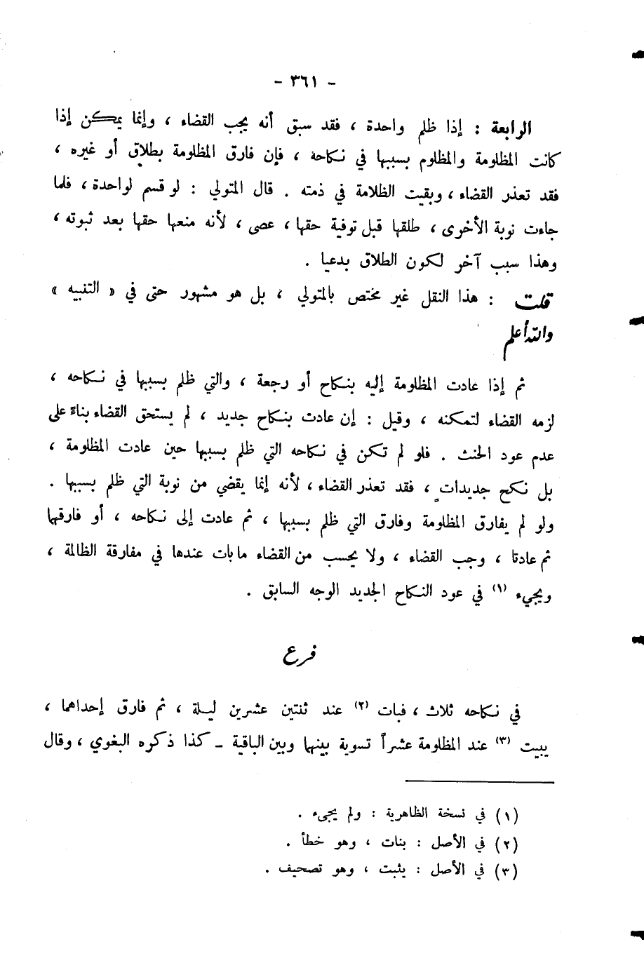 الرَّابِعَةُ: إِذَا ظَلَمَ وَاحِدَةً، فَقَدْ سَبَقَ أَنَّهُ يَجِبُ الْقَضَاءُ، وَإِنَّمَا يُمْكِنُ إِذَا كَانَتِ الْمَظْلُومَةُ وَالْمَظْلُومُ بِسَبَبِهَا فِي نِكَاحِهِ، فَإِنْ فَارَقَ الْمَظْلُومَةَ بِطَلَاقٍ أَوْ غَيْرِهِ، فَقَدْ تَعَذَّرَ الْقَضَاءُ، وَبَقِيَتِ الظُّلَامَةُ فِي ذِمَّتِهِ.