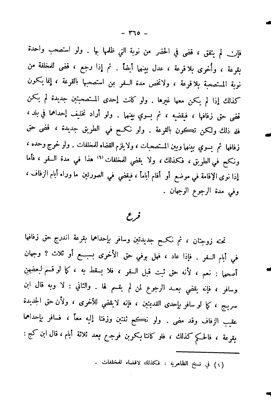 تَحْتَهُ زَوْجَتَانِ، ثُمَّ نَكَحَ جَدِيدَتَيْنِ وَسَافَرَ بِإِحْدَاهُمَا بِقُرْعَةٍ انْدَرَجَ حَقُّ زِفَافِهَا فِي أَيَّامِ السَّفَرِ. فَإِذَا عَادَ، فَهَلْ يُوَفِّي حَقَّ الْأُخْرَى بِسَبْعٍ أَوْ ثَلَاثٍ؟ وَجْهَانِ أَصَحُّهُمَا: نَعَمْ؛ لِأَنَّهُ حَقٌّ ثَبَتَ قَبْلَ السَّفَرِ، فَلَا يَسْقُطُ بِهِ، كَمَا لَوْ قَسَمَ لِبَعْضِهِنَّ وَسَافَرَ، فَإِنَّهُ يَقْضِي بَعْدَ الرُّجُوعِ لِمَنْ لَمْ يَقْسِمْ لَهَا.