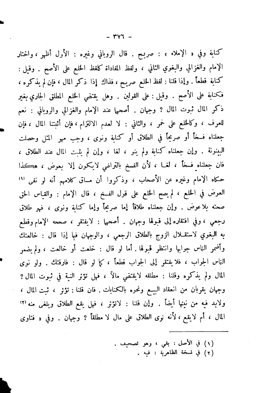 وَإِنْ جَعَلْنَاهُ كِنَايَةً وَلَمْ يَنْوِ، لَغَا، وَإِنْ لَمْ يُثْبِتِ الْمَالَ عِنْدَ الطَّلَاقِ، فَإِنْ جَعَلْنَاهُ فَسْخًا، لَغَا؛ لِأَنَّ الْفَسْخَ بِالتَّرَاضِي لَا يَكُونُ إِلَّا بِعِوَضٍ، هَكَذَا حَكَاهُ الْإِمَامُ وَغَيْرُهُ عَنِ الْأَصْحَابِ، وَذَكَرُوا أَنَّ مَسَاقَ كَلَامِهِمْ أَنَّهُ لَوْ نَفَى الْعِوَضَ فِي الْخُلْعِ، لَمْ يَصِحَّ الْخُلْعُ عَلَى قَوْلِ الْفَسْخِ، قَالَ الْإِمَامُ: وَالْقِيَاسُ الْحَقُّ صِحَّتُهُ بِلَا عِوَضٍ.