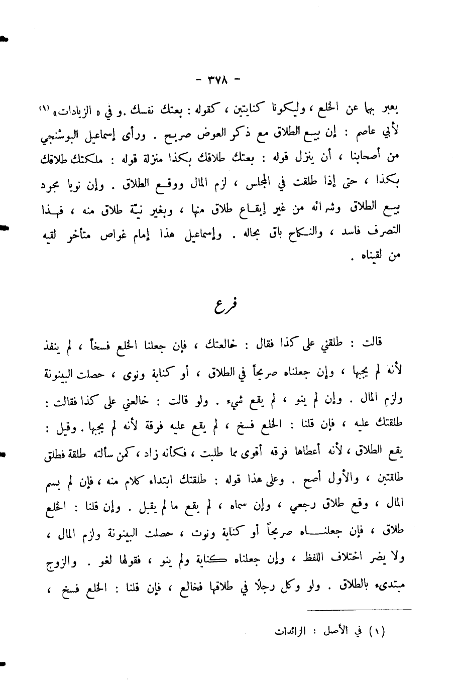 وَرَأَى إِسْمَاعِيلُ الْبُوشَنْجِيُّ مِنْ أَصْحَابِنَا، أَنْ يُنَزَّلَ قَوْلُهُ: بِعْتُكِ طَلَاقَكِ بِكَذَا مَنْزِلَةَ قَوْلِهِ: مَلَّكْتُكِ طَلَاقَكِ بِكَذَا، حَتَّى إِذَا طُلِّقَتْ فِي الْمَجْلِسِ، لَزِمَ الْمَالُ وَوَقَعَ الطَّلَاقُ. وَإِنْ نَوَيَا مُجَرَّدَ بَيْعِ الطَّلَاقِ وَشِرَائِهِ مِنْ غَيْرِ إِيقَاعِ طَلَاقٍ مِنْهَا، وَبِغَيْرِ نِيَّةِ طَلَاقٍ مِنْهُ، فَهَذَا التَّصَرُّفُ فَاسِدٌ، وَالنِّكَاحُ بَاقٍ بِحَالِهِ. وَإِسْمَاعِيلُ هَذَا إِمَامٌ غَوَّاصٌ مُتَأَخِّرٌ لَقِيَهُ مَنْ لَقِينَاهُ.
