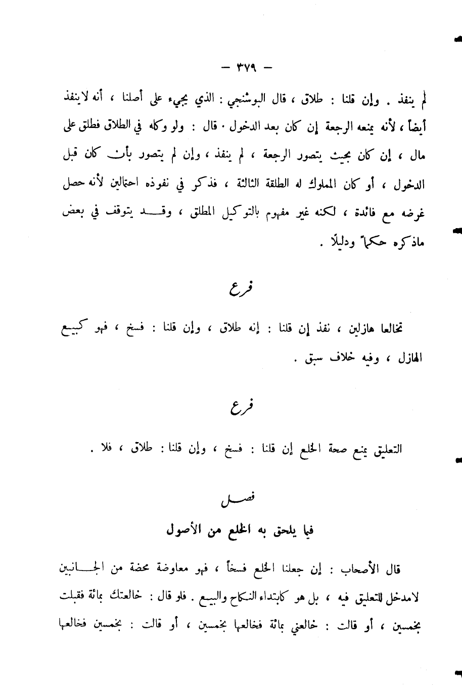 لَمْ يَنْفُذْ. وَإِنْ قُلْنَا: طَلَاقٌ، قَالَ الْبُوشَنْجِيُّ: الَّذِي يَجِيءُ عَلَى أَصْلِنَا، أَنَّهُ لَا يَنْفُذُ أَيْضًا؛ لِأَنَّهُ يَمْنَعُهُ الرَّجْعَةَ إِنْ كَانَ بَعْدَ الدُّخُولِ. قَالَ: وَلَوْ وَكَّلَهُ فِي الطَّلَاقِ فَطَلَّقَ عَلَى مَالٍ، إِنْ كَانَ بِحَيْثُ يُتَصَوَّرُ الرَّجْعَةُ، لَمْ يَنْفُذْ، وَإِنْ لَمْ يُتَصَوَّرْ بِأَنْ كَانَ قَبْلَ الدُّخُولِ، أَوْ كَانَ الْمَمْلُوكُ لَهُ الطَّلْقَةُ الثَّالِثَةُ، فَذَكَرَ فِي نُفُوذِهِ احْتِمَالَيْنِ لِأَنَّهُ حَصَلَ غَرَضُهُ مَعَ فَائِدَةٍ، لَكِنَّهُ غَيْرُ مَفْهُومٍ بِالتَّوْكِيلِ الْمُطْلَقِ، وَقَدْ يَتَوَقَّفُ فِي بَعْضِ مَا ذَكَرَهُ حُكْمًا وَدَلِيلًا.