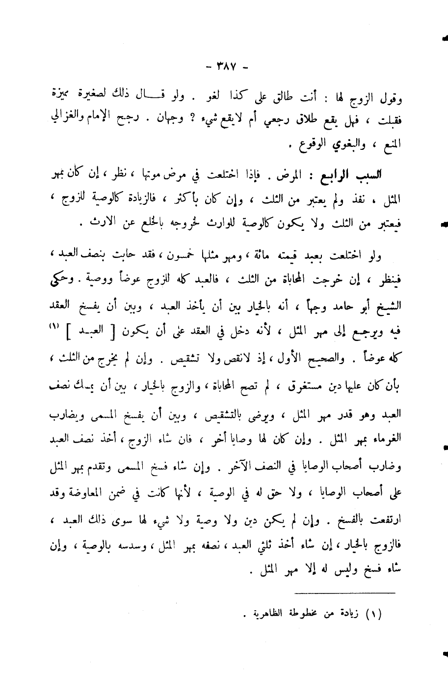 السَّبَبُ الرَّابِعُ: الْمَرَضُ. فَإِذَا اخْتَلَعَتْ فِي مَرَضِ مَوْتِهَا، نُظِرَ، إِنْ كَانَ بِمَهْرِ الْمِثْلِ، نَفَذَ وَلَمْ يُعْتَبَرْ مِنَ الثُّلُثِ، وَإِنْ كَانَ بِأَكْثَرَ، فَالزِّيَادَةُ كَالْوَصِيَّةِ لِلزَّوْجِ، فَيُعْتَبَرُ مِنَ الثُّلُثِ وَلَا يَكُونُ كَالْوَصِيَّةِ لِلْوَارِثِ لِخُرُوجِهِ بِالْخُلْعِ عَنِ الْإِرْثِ.