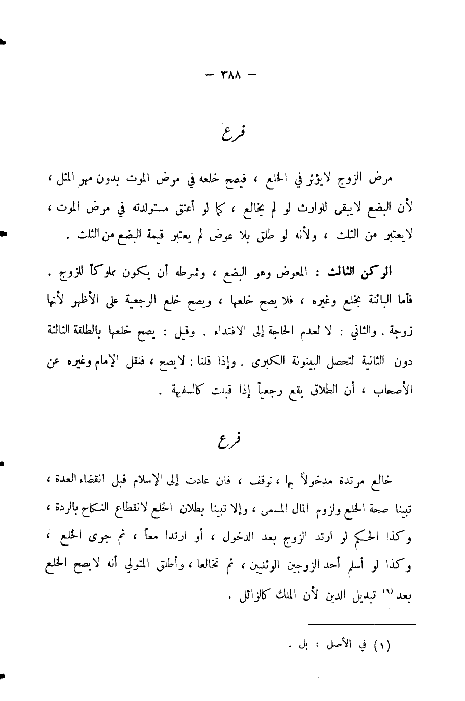 الرُّكْنُ الثَّالِثُ: الْمُعَوَّضُ وَهُوَ الْبُضْعُ، وَشَرْطُهُ أَنْ يَكُونَ مَمْلُوكًا لِلزَّوْجِ. فَأَمَّا الْبَائِنَةُ بِخُلْعٍ وَغَيْرِهِ، فَلَا يَصِحُّ خُلْعُهَا، وَيَصِحُّ خُلْعُ الرَّجْعِيَّةِ عَلَى الْأَظْهَرِ لِأَنَّهَا زَوْجَةٌ. وَالثَّانِي: لَا لِعَدَمِ الْحَاجَةِ إِلَى الِافْتِدَاءِ.