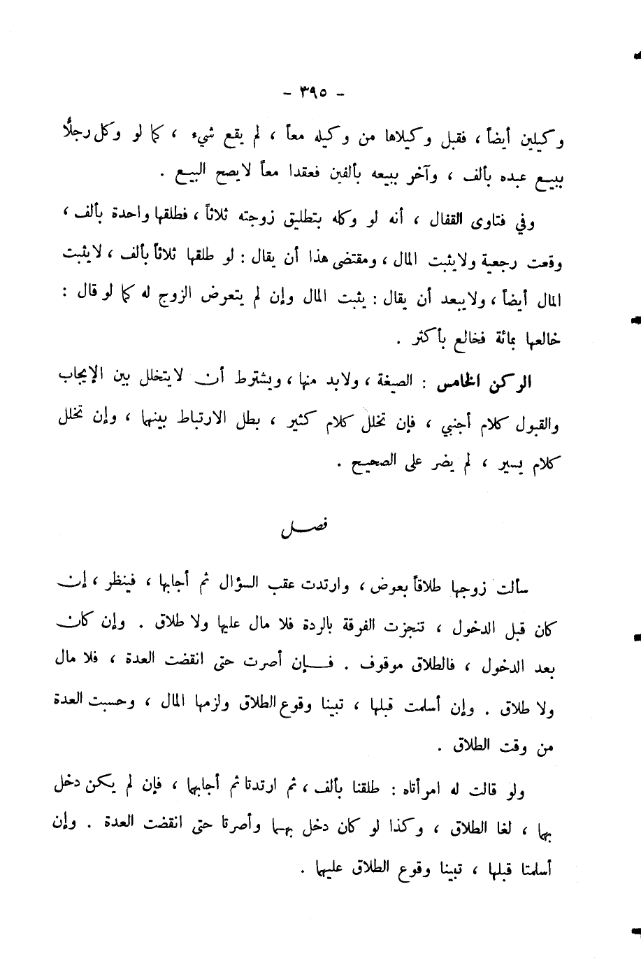 الرُّكْنُ الْخَامِسُ: الصِّيغَةُ، وَلَا بُدَّ مِنْهَا، وَيُشْتَرَطُ أَنْ لَا يَتَخَلَّلَ بَيْنَ الْإِيجَابِ وَالْقَبُولِ كَلَامٌ أَجْنَبِيٌّ، فَإِنْ تَخَلَّلَ كَلَامٌ كَثِيرٌ، بَطَلَ الِارْتِبَاطُ بَيْنَهُمَا، وَإِنْ تَخَلَّلَ كَلَامٌ يَسِيرٌ، لَمْ يَضُرَّ عَلَى الصَّحِيحِ.