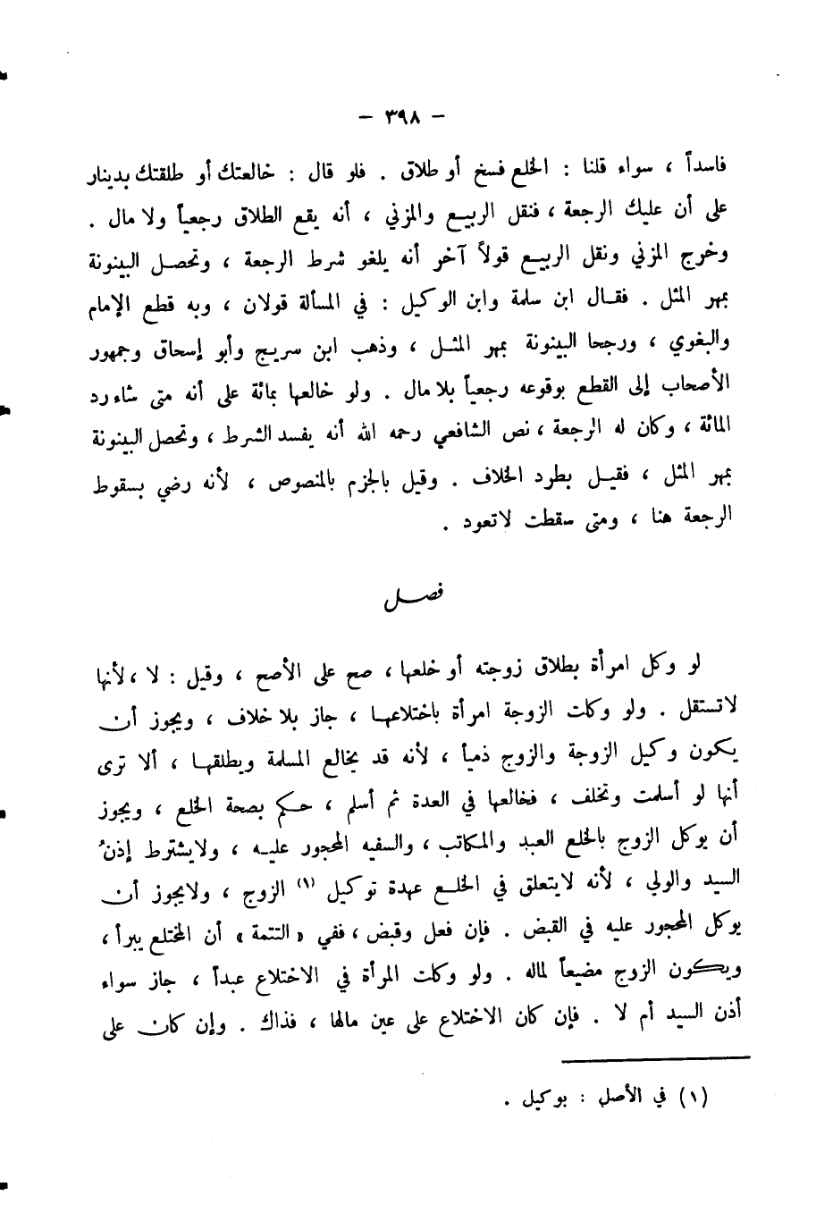 لَوْ وَكَّلَ امْرَأَةً بِطَلَاقِ زَوْجَتِهِ أَوْ خُلْعِهَا، صَحَّ عَلَى الْأَصَحِّ، وَقِيلَ: لَا؛ لِأَنَّهَا لَا تَسْتَقِلُّ. وَلَوْ وَكَّلَتِ الزَّوْجَةُ امْرَأَةً بِاخْتِلَاعِهَا، جَازَ بِلَا خِلَافٍ، وَيَجُوزُ أَنْ يَكُونَ وَكِيلُ الزَّوْجَةِ وَالزَّوْجِ ذِمِّيًّا؛ لِأَنَّهُ قَدْ يُخَالِعُ الْمُسْلِمَةَ وَيُطَلِّقُهَا، أَلَا تَرَى أَنَّهَا لَوْ أَسْلَمَتْ وَتَخَلَّفَ، فَخَالَعَهَا فِي الْعِدَّةِ ثُمَّ أَسْلَمَ، حُكِمَ بِصِحَّةِ الْخُلْعِ، وَيَجُوزُ أَنْ يُوَكِّلَ الزَّوْجُ بِالْخُلْعِ الْعَبْدَ وَالْمَكَاتَبَ، وَالسَّفِيهَ الْمَحْجُورَ عَلَيْهِ، وَلَا يُشْتَرَطُ إِذْنُ السَّيِّدِ وَالْوَلِيِّ؛ لِأَنَّهُ لَا يَتَعَلَّقُ فِي الْخُلْعِ عُهْدَةُ تَوْكِيلِ الزَّوْجِ، وَلَا يَجُوزُ أَنْ يُوَكَّلَ الْمَحْجُورُ عَلَيْهِ فِي الْقَبْضِ.