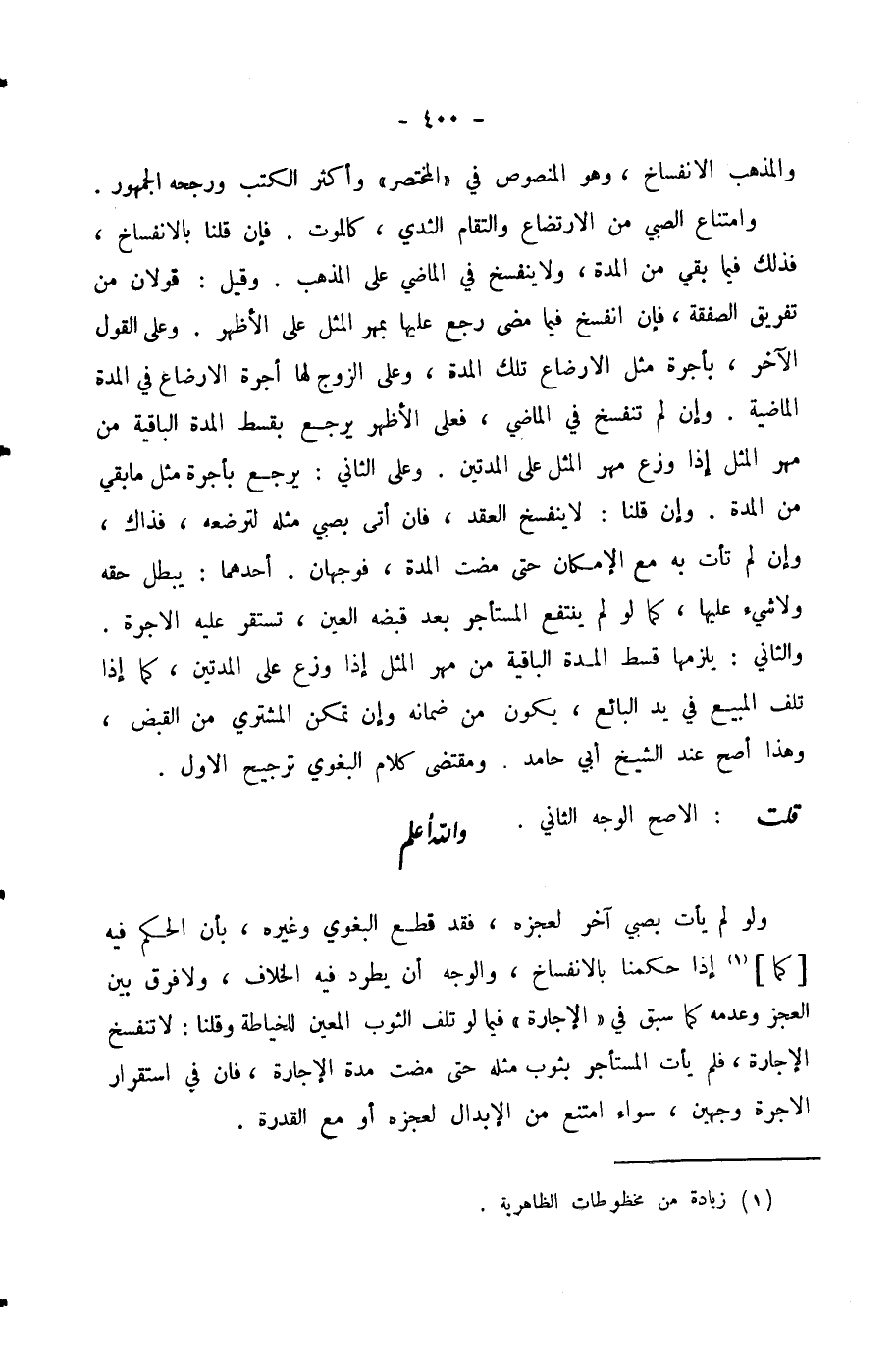 وَعَلَى الْقَوْلِ الْآخَرِ، بِأُجْرَةِ مِثْلِ الْإِرْضَاعِ تِلْكَ الْمُدَّةَ، وَعَلَى الزَّوْجِ لَهَا أُجْرَةُ الْإِرْضَاعِ فِي الْمُدَّةِ الْمَاضِيَةِ. وَإِنْ لَمْ تَنْفَسِخْ فِي الْمَاضِي، فَعَلَى الْأَظْهَرِ يَرْجِعُ بِقِسْطِ الْمُدَّةِ الْبَاقِيَةِ مِنْ مَهْرِ الْمِثْلِ إِذَا وُزِّعَ مَهْرُ الْمِثْلِ عَلَى الْمُدَّتَيْنِ.