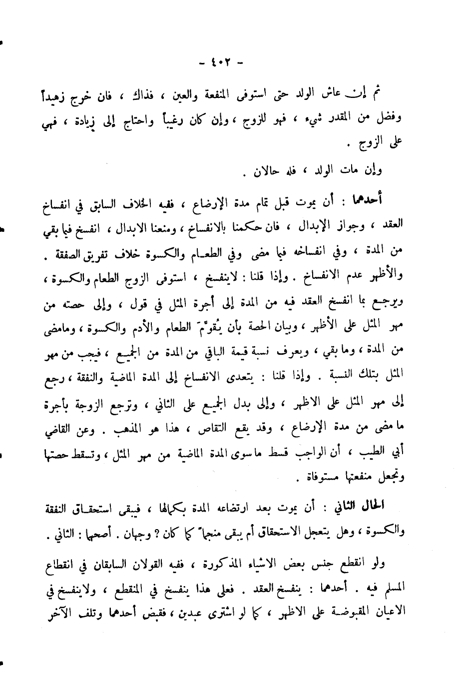 وَإِذَا قُلْنَا: لَا يَنْفَسِخُ، اسْتَوْفَى الزَّوْجُ الطَّعَامَ وَالْكُسْوَةَ، وَيَرْجِعُ بِمَا انْفَسَخَ الْعَقْدُ فِيهِ مِنَ الْمُدَّةِ إِلَى أُجْرَةِ الْمِثْلِ فِي قَوْلٍ، وَإِلَى حِصَّتِهِ مِنْ مَهْرِ الْمِثْلِ عَلَى الْأَظْهَرِ، وَبَيَانُ الْحِصَّةِ بِأَنْ يُقَوَّمَ الطَّعَامُ وَالْأُدْمُ وَالْكُسْوَةُ، وَمَا مَضَى مِنَ الْمُدَّةِ، وَمَا بَقِيَ، وَيُعْرَفُ نِسْبَةُ قِيمَةِ الْبَاقِي مِنَ الْمُدَّةِ مِنَ الْجَمِيعِ، فَيَجِبُ مِنْ مَهْرِ الْمِثْلِ بِتِلْكَ النِّسْبَةِ.