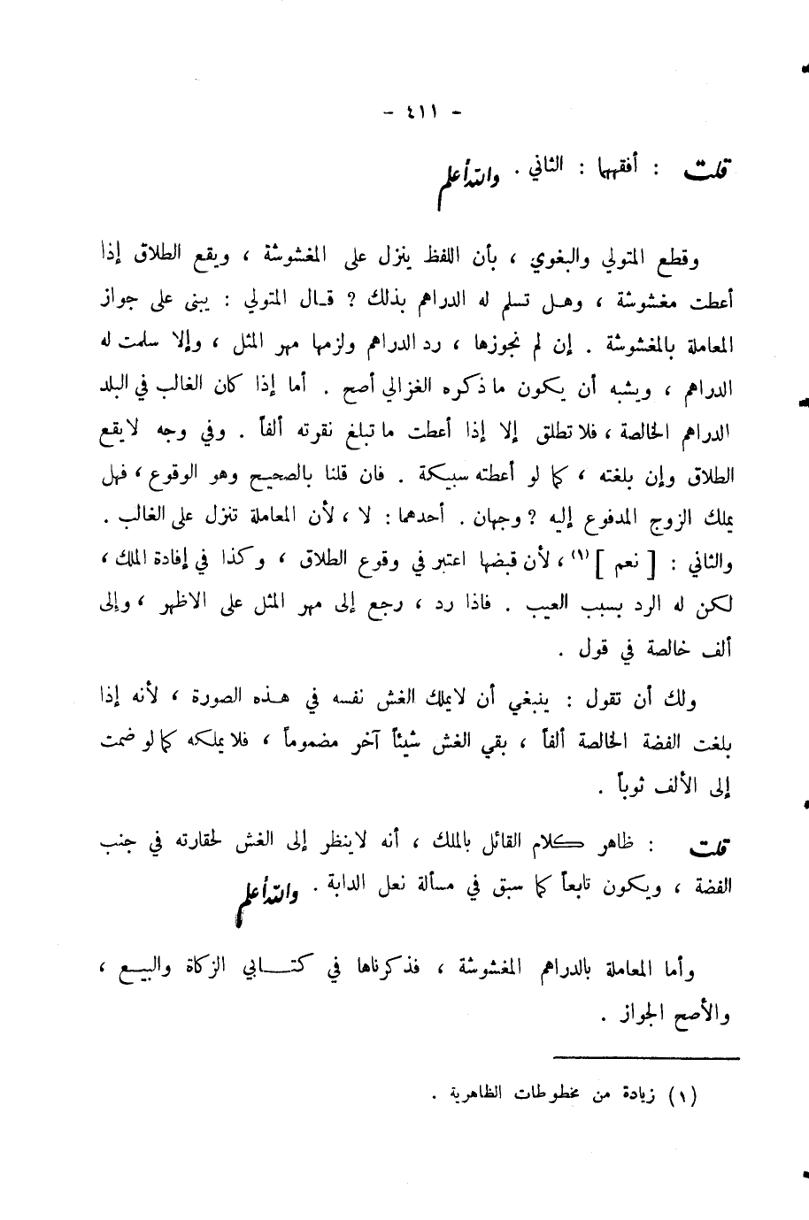 وَقَطَعَ الْمُتَوَلِّي وَالْبَغَوِيُّ، بِأَنَّ اللَّفْظَ يُنَزَّلُ عَلَى الْمَغْشُوشَةِ، وَيَقَعُ الطَّلَاقُ إِذَا أَعْطَتْ مَغْشُوشَةً، وَهَلْ تُسَلَّمُ لَهُ الدَّرَاهِمُ بِذَلِكَ؟ قَالَ الْمُتَوَلِّي: يُبْنَى عَلَى جَوَازِ الْمُعَامَلَةِ بِالْمَغْشُوشَةِ.