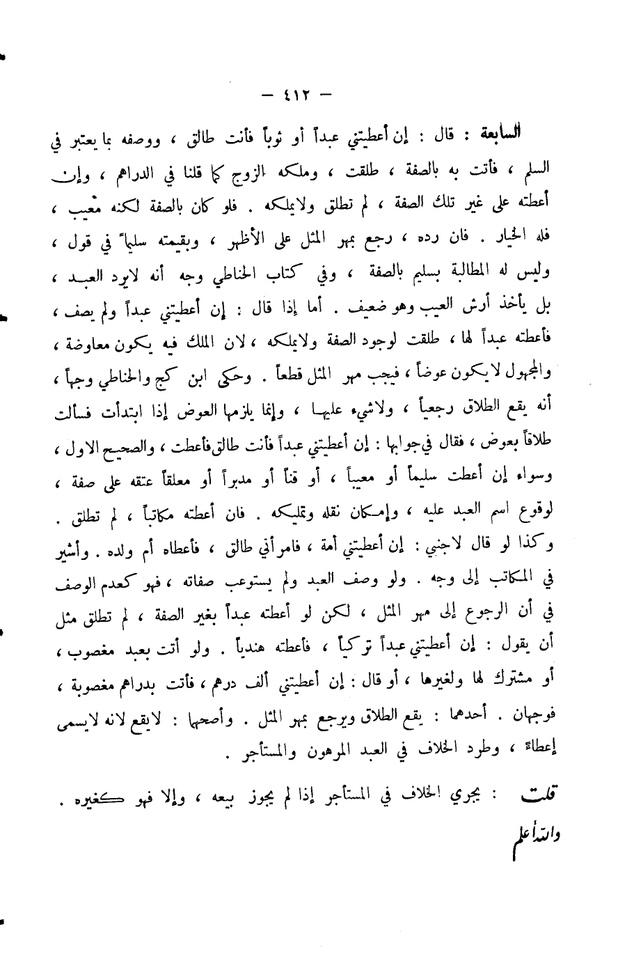 السَّابِعَةُ: قَالَ: إِنْ أَعْطَيْتِنِي عَبْدًا أَوْ ثَوْبًا فَأَنْتِ طَالِقٌ، وَوَصَفَهُ بِمَا يُعْتَبَرُ فِي السَّلَمِ، فَأَتَتْ بِهِ بِالصِّفَةِ، طُلِّقَتْ، وَمَلَكَهُ الزَّوْجُ كَمَا قُلْنَا فِي الدَّرَاهِمِ، وَإِنْ أَعْطَتْهُ عَلَى غَيْرِ تِلْكَ الصِّفَةِ، لَمْ تُطَلَّقْ وَلَا يَمْلِكُهُ.