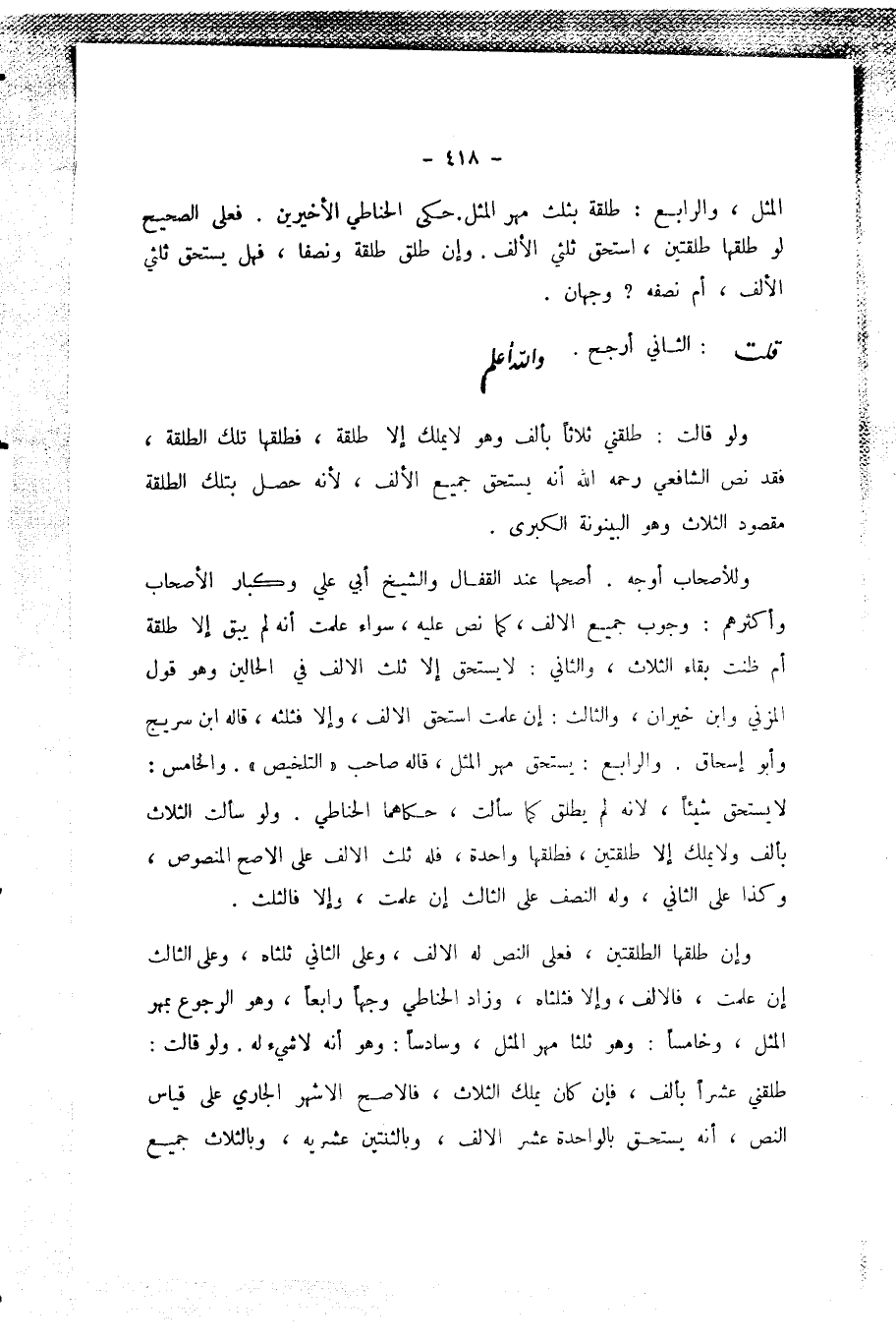 وَلِلْأَصْحَابِ أَوْجُهٌ. أَصَحُّهَا عِنْدَ الْقَفَّالِ وَالشَّيْخِ أَبِي عَلِيٍّ وَكِبَارِ الْأَصْحَابِ وَأَكْثَرِهِمْ: وُجُوبُ جَمِيعِ الْأَلْفِ، كَمَا نَصَّ عَلَيْهِ، سَوَاءٌ عَلِمَتْ أَنَّهُ لَمْ يَبْقَ إِلَّا طَلْقَةٌ أَمْ ظَنَّتْ بَقَاءَ الثَّلَاثِ، وَالثَّانِي: لَا يَسْتَحِقُّ إِلَّا ثُلُثَ الْأَلْفِ فِي الْحَالَيْنِ وَهُوَ قَوْلُ الْمُزَنِيِّ وَابْنِ خَيْرَانَ، وَالثَّالِثُ: إِنْ عَلِمَتِ اسْتَحَقَّ الْأَلْفَ، وَإِلَّا فَثُلُثَهُ، قَالَهُ ابْنُ سُرَيْجٍ وَأَبُو إِسْحَاقَ.