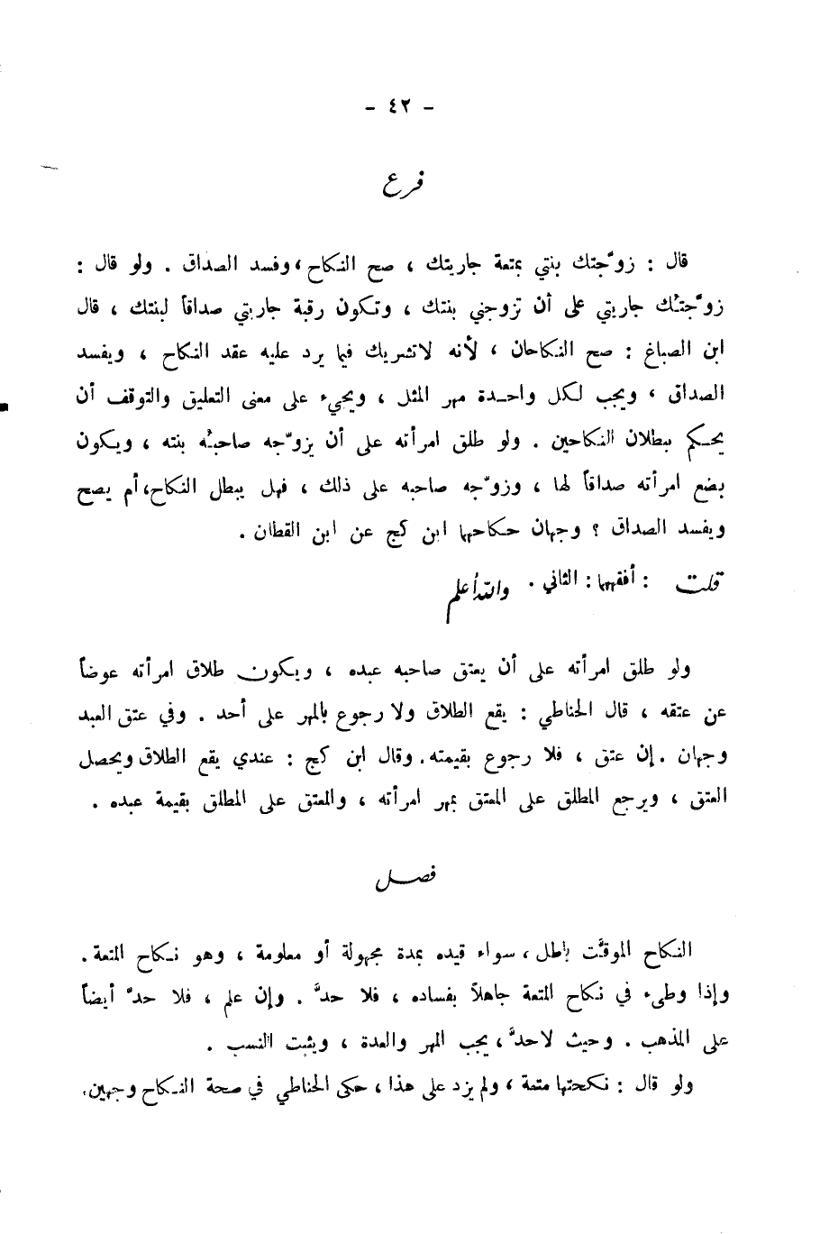 قَالَ: زَوَّجْتُكَ بِنْتِي بِمُتْعَةِ جَارِيَتِكَ، صَحَّ النِّكَاحُ، وَفَسَدَ الصَّدَاقُ. وَلَوْ قَالَ: زَوَّجْتُكَ جَارِيَتِي عَلَى أَنْ تُزَوِّجَنِي بِنْتَكَ، وَتَكُونَ رَقَبَةُ جَارِيَتِي صَدَاقًا لِبِنْتِكَ، قَالَ ابْنُ الصَّبَّاغِ: صَحَّ النِّكَاحَانِ، لِأَنَّهُ لَا تَشْرِيكَ فِيمَا يَرِدُ عَلَيْهِ عَقْدُ النِّكَاحِ، وَيَفْسُدُ الصَّدَاقُ، وَيَجِبُ لِكُلِّ وَاحِدَةٍ مَهْرُ الْمِثْلِ، وَيَجِيءُ عَلَى مَعْنَى التَّعْلِيقِ وَالتَّوَقُّفِ أَنْ يُحْكَمَ بِبُطْلَانِ النِّكَاحَيْنِ.