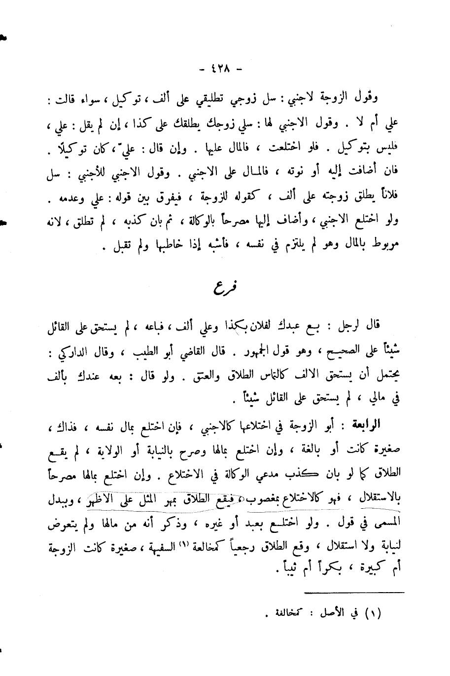 الرَّابِعَةُ: أَبُو الزَّوْجَةِ فِي اخْتِلَاعِهَا كَالْأَجْنَبِيِّ، فَإِنِ اخْتَلَعَ بِمَالِ نَفْسِهِ، فَذَاكَ، صَغِيرَةً كَانَتْ أَوْ بَالِغَةً، وَإِنِ اخْتَلَعَ بِمَالِهَا وَصَرَّحَ بِالنِّيَابَةِ أَوِ الْوِلَايَةِ، لَمْ يَقَعِ الطَّلَاقُ كَمَا لَوْ بَانَ كَذِبُ مُدَّعِي الْوَكَالَةِ فِي الِاخْتِلَاعِ.