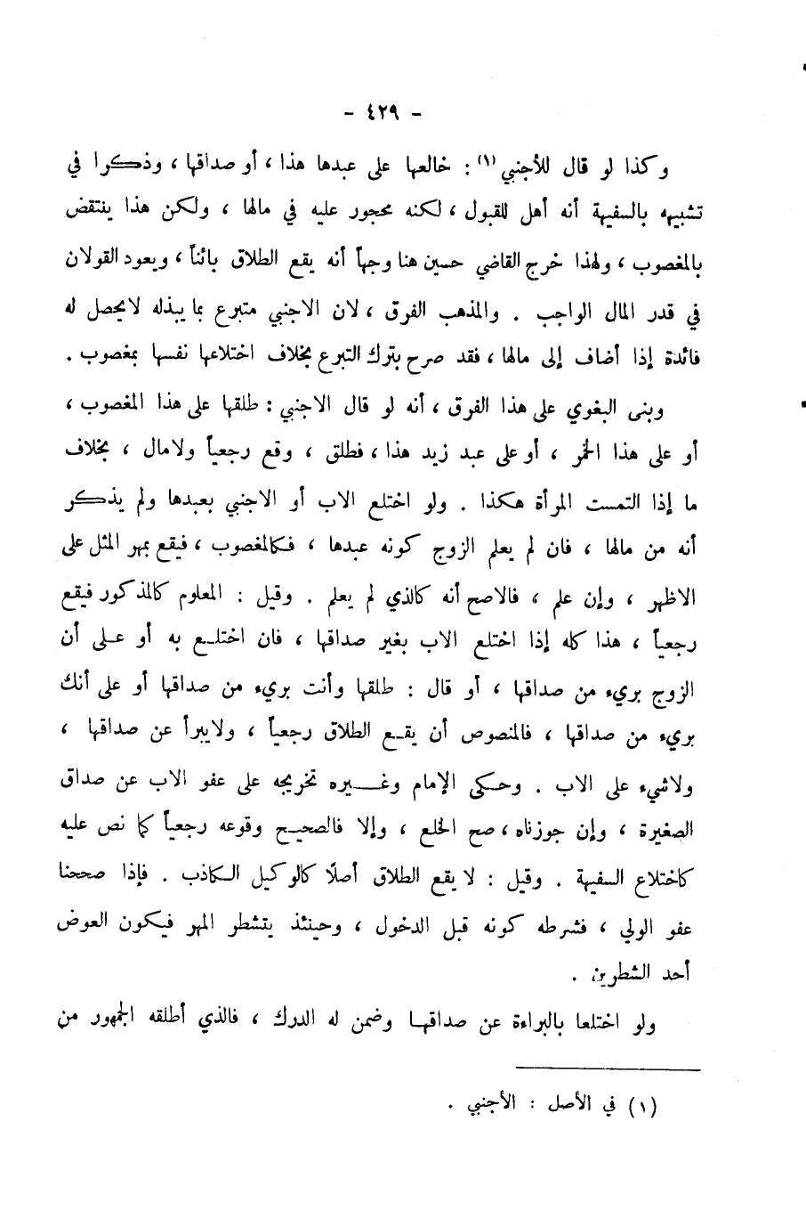 وَكَذَا لَوْ قَالَ لِلْأَجْنَبِيِّ: خَالِعْهَا عَلَى عَبْدِهَا هَذَا، أَوْ صَدَاقِهَا، وَذَكَرَا فِي تَشْبِيهِهِ بِالسَّفِيهَةِ أَنَّهُ أَهْلٌ لِلْقَبُولِ، لَكِنَّهُ مَحْجُورٌ عَلَيْهِ فِي مَالِهَا، وَلَكِنَّ هَذَا يَنْتَقِضُ بِالْمَغْصُوبِ، وَلِهَذَا خَرَّجَ الْقَاضِي حُسَيْنٌ هُنَا وَجْهًا أَنَّهُ يَقَعُ الطَّلَاقُ بَائِنًا، وَيَعُودُ الْقَوْلَانِ فِي قَدْرِ الْمَالِ الْوَاجِبِ.