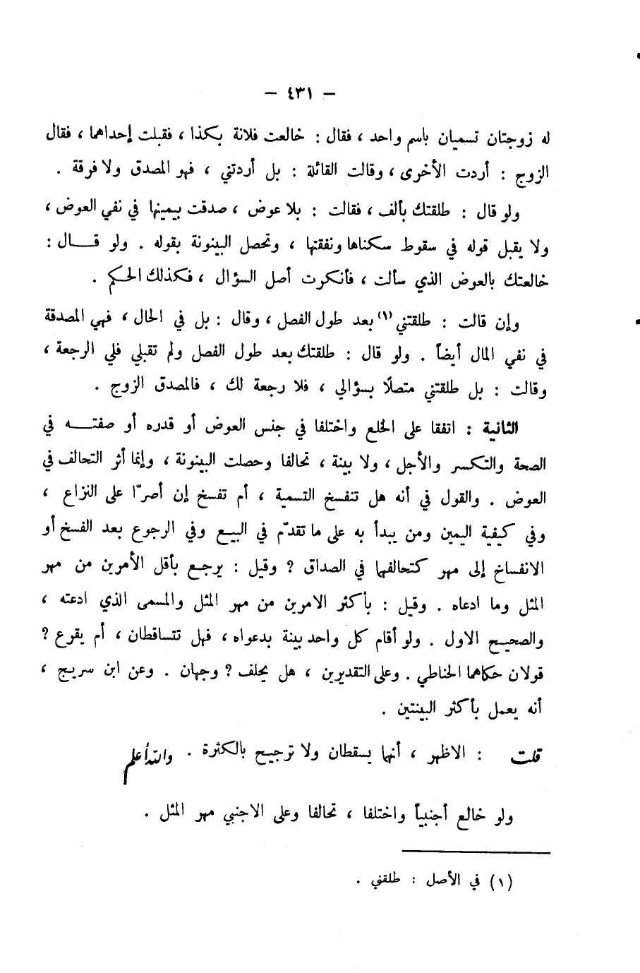 لَهُ زَوْجَتَانِ تُسَمَّيَانِ بِاسْمٍ وَاحِدٍ، فَقَالَ: خَالَعْتُ فُلَانَةَ بِكَذَا، فَقَبِلَتْ إِحْدَاهُمَا، فَقَالَ الزَّوْجُ: أَرَدْتُ الْأُخْرَى، وَقَالَتِ الْقَائِلَةُ: بَلْ أَرَدْتَنِي، فَهُوَ الْمُصَدَّقُ وَلَا فُرْقَةَ.