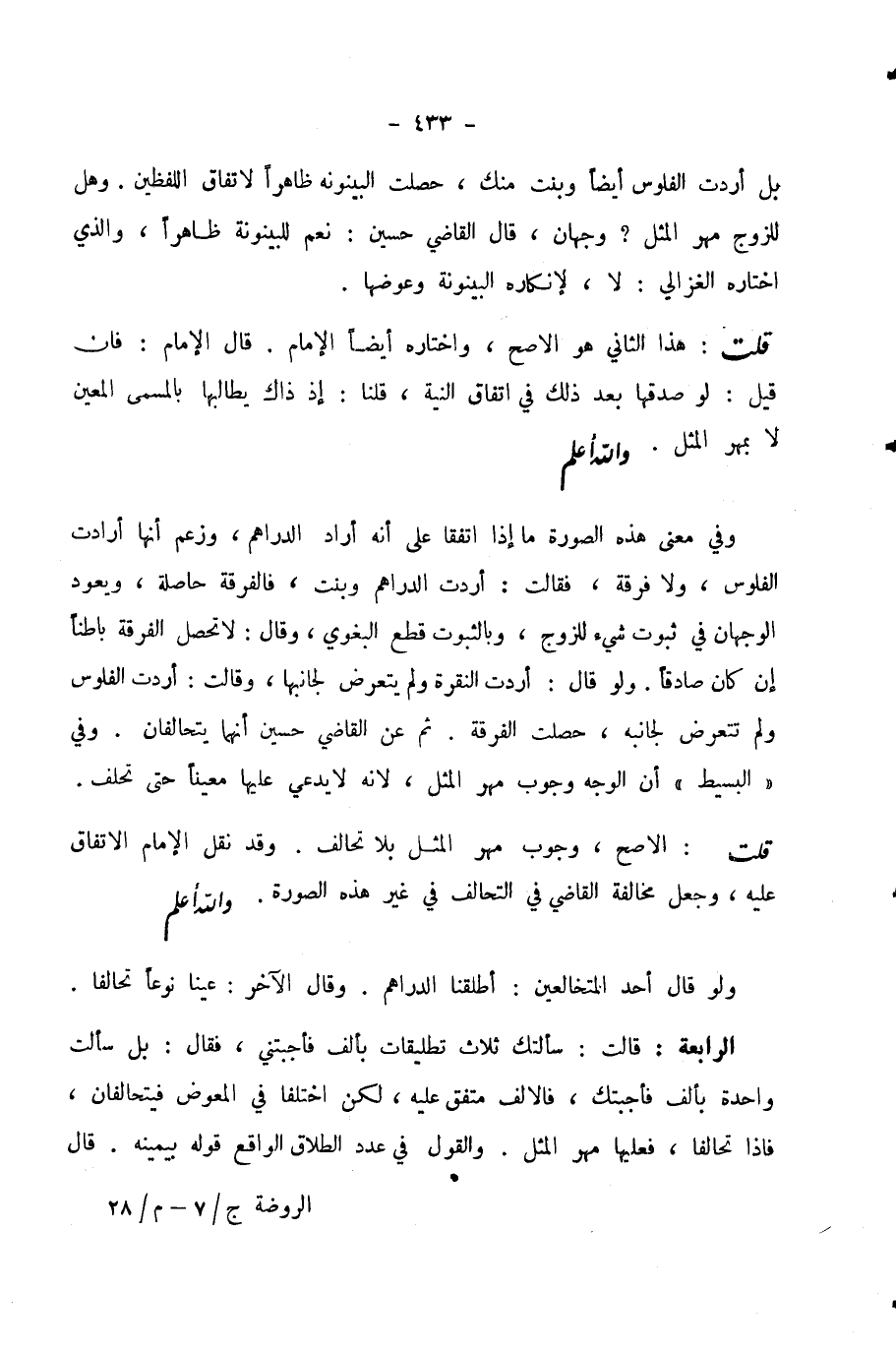 وَفِي مَعْنَى هَذِهِ الصُّورَةِ مَا إِذَا اتَّفَقَا عَلَى أَنَّهُ أَرَادَ الدَّرَاهِمَ، وَزَعَمَ أَنَّهَا أَرَادَتِ الْفُلُوسَ، وَلَا فُرْقَةَ، فَقَالَتْ: أَرَدْتُ الدَّرَاهِمَ وَبِنْتُ، فَالْفُرْقَةُ حَاصِلَةٌ، وَيَعُودُ الْوَجْهَانِ فِي ثُبُوتِ شَيْءٍ لِلزَّوْجِ، وَبِالثُّبُوتِ قَطَعَ الْبَغَوِيُّ، وَقَالَ: لَا تَحْصُلُ الْفُرْقَةُ بَاطِنًا إِنْ كَانَ صَادِقًا.