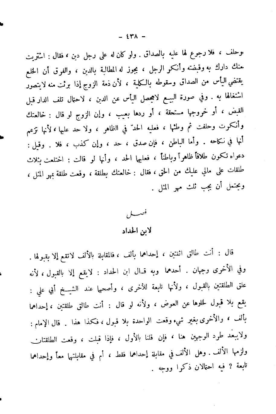 وَفِي صُورَةِ الْبَيْعِ لَا يَحْصُلُ الْيَأْسُ عَنِ الدَّيْنِ، لِاحْتِمَالِ تَلَفِ الدَّارِ قَبْلَ الْقَبْضِ، أَوْ خُرُوجِهَا مُسْتَحَقَّةً، أَوْ رَدِّهَا بِعَيْبٍ، وَإِنَّ الزَّوْجَ لَوْ قَالَ: خَالَعْتُكِ وَأَنْكَرَتْ وَحَلَفَتْ ثُمَّ وَطِئَهَا، فَعَلَيْهِ الْحَدُّ فِي الظَّاهِرِ، وَلَا حَدَّ عَلَيْهَا؛ لِأَنَّهَا تَزْعُمُ أَنَّهَا فِي نِكَاحِهِ.