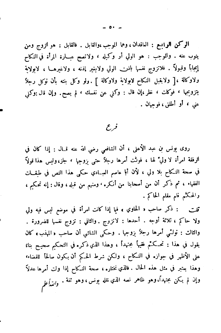 رَوَى يُونُسُ بْنُ عَبْدِ الْأَعْلَى، أَنَّ الشَّافِعِيَّ - رَضِيَ اللَّهُ عَنْهُ - قَالَ: إِذَا كَانَ فِي الرُّفْقَةِ امْرَأَةٌ لَا وَلِيَّ لَهَا، فَوَلَّتْ أَمْرَهَا رَجُلًا حَتَّى يُزَوِّجَهَا، جَازَ، وَلَيْسَ هَذَا قَوْلًا فِي صِحَّةِ النِّكَاحِ بِلَا وَلِيٍّ، لِأَنَّ أَبَا عَاصِمٍ الْعَبَّادِيَّ حَكَى هَذَا النَّصَّ فِي طَبَقَاتِ الْفُقَهَاءِ، ثُمَّ ذَكَرَ أَنَّ مِنْ أَصْحَابِنَا مَنْ أَنْكَرَهُ، وَمِنْهُمْ مَنْ قَبِلَهُ، وَقَالَ: إِنَّهُ تَحْكِيمٌ، وَالْمُحَكَّمُ قَامَ مَقَامَ الْحَاكِمِ.