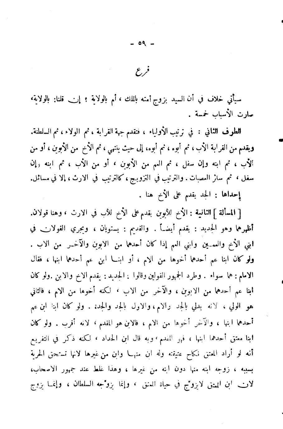 الطَّرَفُ الثَّانِي: فِي تَرْتِيبِ الْأَوْلِيَاءِ، فَتُقَدَّمُ جِهَةُ الْقَرَابَةِ، ثُمَّ الْوَلَاءِ، ثُمَّ السَّلْطَنَةِ. وَيُقَدَّمُ مِنَ الْقَرَابَةِ الْأَبُ، ثُمَّ أَبُوهُ، ثُمَّ أَبُوهُ، إِلَى حَيْثُ يَنْتَهِي، ثُمَّ الْأَخُ مِنَ الْأَبَوَيْنِ، أَوْ مِنَ الْأَبِ، ثُمَّ ابْنُهُ وَإِنْ سَفَلَ، ثُمَّ الْعَمُّ مِنَ الْأَبَوَيْنِ، أَوْ مِنَ الْأَبِ، ثُمَّ ابْنُهُ وَإِنْ سَفَلَ، ثُمَّ سَائِرُ الْعَصَبَاتِ. وَالتَّرْتِيبُ فِي التَّزْوِيجِ، كَالتَّرْتِيبِ فِي الْإِرْثِ، إِلَّا فِي مَسَائِلَ.