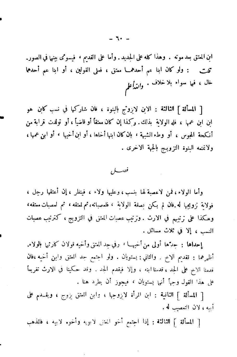وَأَمَّا الْوَلَاءُ، فَمَنْ لَا عَصَبَةَ لَهَا بِنَسَبٍ، وَعَلَيْهَا وَلَاءٌ، فَيُنْظَرُ، إِنْ أَعْتَقَهَا رَجُلٌ، فَوَلَايَةُ تَزْوِيجِهَا لَهُ. فَإِنْ لَمْ يَكُنْ بِصِفَةِ الْوَلَايَةِ، فَلِعَصَبَاتِهِ، ثُمَّ لِمُعْتِقِهِ، ثُمَّ لِعَصِبَاتِ مُعْتِقِهِ، وَهَكَذَا عَلَى تَرْتِيبِهِمْ فِي الْإِرْثِ. وَتَرْتِيبُ عَصَبَاتِ الْمُعْتِقِ فِي التَّزْوِيجِ، كَتَرْتِيبِ عَصَبَاتِ النَّسَبِ، إِلَّا فِي ثَلَاثِ مَسَائِلَ.