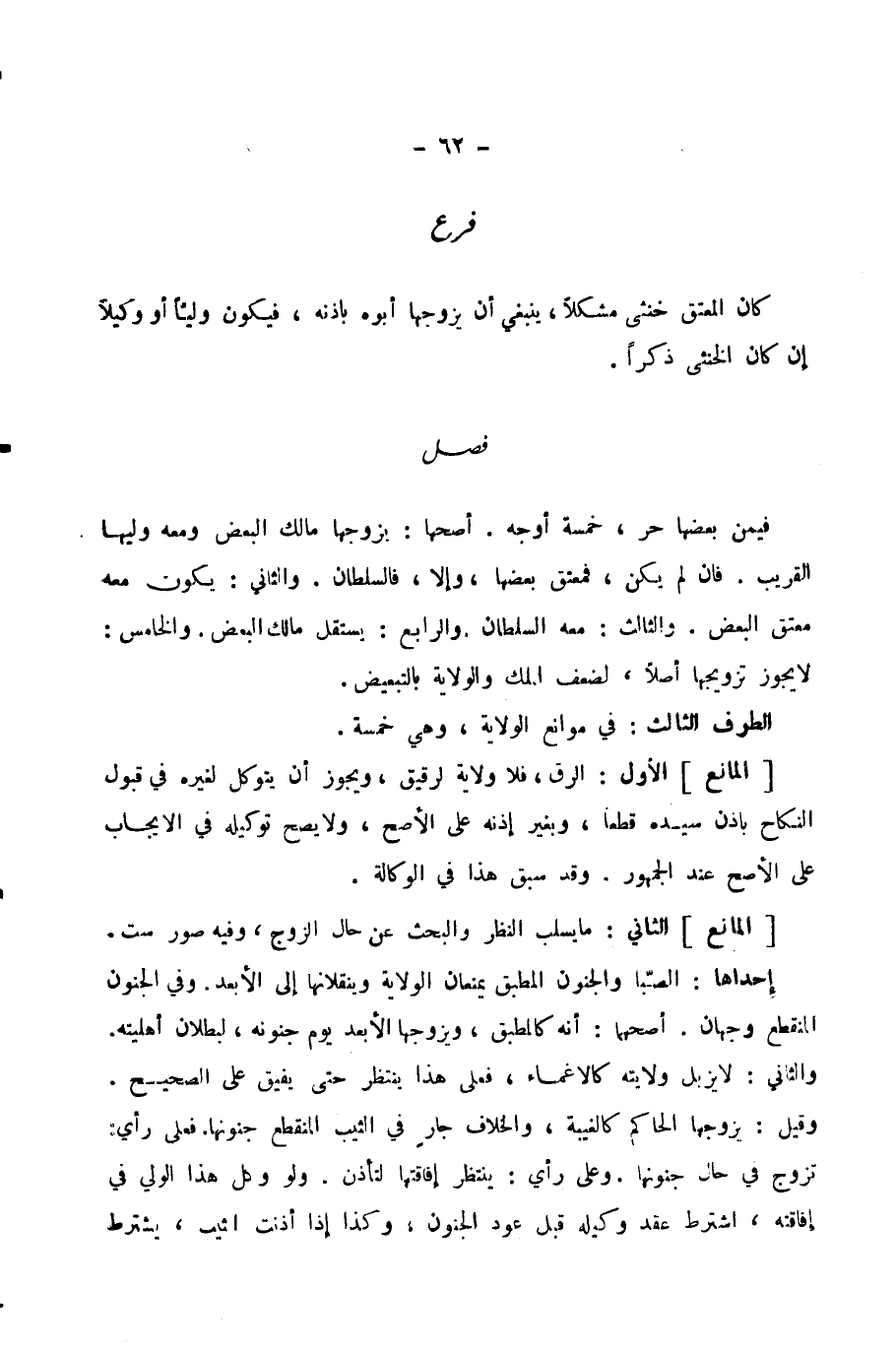 (الْمَانِعُ) الْأَوَّلُ: الرِّقُّ، فَلَا وَلَايَةَ لِرَقِيقٍ، وَيَجُوزُ أَنْ يَتَوَكَّلَ لِغَيْرِهِ فِي قَبُولِ النِّكَاحِ بِإِذْنِ سَيِّدِهِ قَطْعًا، وَبِغَيْرِ إِذْنِهِ عَلَى الْأَصَحِّ، وَلَا يَصِحُّ تَوْكِيلُهُ فِي الْإِيجَابِ عَلَى الْأَصَحِّ عِنْدَ الْجُمْهُورِ. وَقَدْ سَبَقَ هَذَا فِي الْوَكَالَةِ.