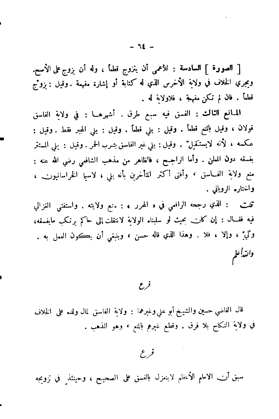الْمَانِعُ الثَّالِثُ: الْفِسْقُ فِيهِ سَبْعُ طُرُقٍ. أَشْهَرُهَا: فِي وَلَايَةِ الْفَاسِقِ قَوْلَانِ، وَقِيلَ بِالْمَنْعِ قَطْعًا. وَقِيلَ: يَلِي قَطْعًا. وَقِيلَ: يَلِي الْمُجْبَرُ فَقَطْ. وَقِيلَ: عَكْسُهُ، لِأَنَّهُ لَا يَسْتَقِلُّ. وَقِيلَ: يَلِي غَيْرُ الْفَاسِقِ بِشُرْبِ الْخَمْرِ. وَقِيلَ: يَلِي الْمُسْتَتِرُ بِفِسْقِهِ دُونَ الْمُعْلِنِ. وَأَمَّا الرَّاجِحُ، فَالظَّاهِرُ مِنْ مَذْهَبِ الشَّافِعِيِّ - رَضِيَ اللَّهُ عَنْهُ -: مَنْعُ وَلَايَةِ الْفَاسِقِ، وَأَفْتَى أَكْثَرُ الْمُتَأَخِّرِينَ بِأَنَّهُ يَلِي، لَا سِيَّمَا الْخُرَاسَانِيُّونَ، وَاخْتَارَهُ الرُّويَانِيُّ.