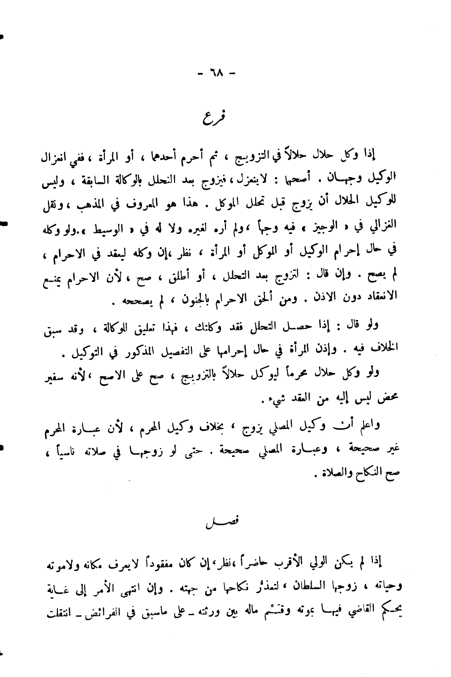 إِذَا وَكَّلَ حَلَالٌ حَلَالًا فِي التَّزْوِيجِ، ثُمَّ أَحْرَمَ أَحَدُهُمَا، أَوِ الْمَرْأَةُ، فَفِي انْعِزَالِ الْوَكِيلِ وَجْهَانِ. أَصَحُّهُمَا: لَا يَنْعَزِلُ، فَيُزَوِّجُ بَعْدَ التَّحَلُّلِ بِالْوَكَالَةِ السَّابِقَةِ، وَلَيْسَ لِلْوَكِيلِ الْحَلَالِ أَنْ يُزَوِّجَ قَبْلَ تَحَلُّلِ الْمُوَكِّلِ. هَذَا هُوَ الْمَعْرُوفُ فِي الْمَذْهَبِ، وَنَقَلَ الْغَزَالِيُّ فِي الْوَجِيزِ فِيهِ وَجْهًا، وَلَمْ أَرَهُ لِغَيْرِهِ وَلَا لَهُ فِي الْوَسِيطِ. وَلَوْ وَكَّلَهُ فِي حَالِ إِحْرَامِ الْوَكِيلِ أَوِ الْمُوَكِّلِ أَوِ الْمَرْأَةِ، نُظِرَ، إِنَّ وَكَّلَهُ لِيَعْقِدَ فِي الْإِحْرَامِ، لَمْ يَصِحَّ. وَإِنْ قَالَ: لِتُزَوَّجَ بَعْدَ التَّحَلُّلِ، أَوْ أُطَلِّقَ، صَحَّ، لِأَنَّ الْإِحْرَامَ يَمْنَعُ الِانْعِقَادَ دُونَ الْإِذْنِ. وَمَنْ أَلْحَقَ الْإِحْرَامَ بِالْجُنُونِ، لَمْ يُصَحِّحْهُ.