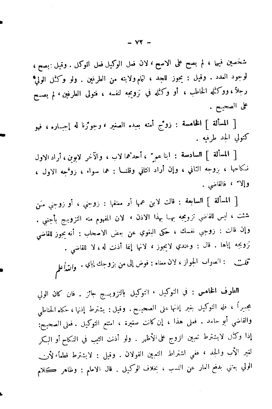 [الْمَسْأَلَةُ] السَّابِعَةُ: قَالَتْ لِابْنِ عَمِّهَا أَوْ مُعْتِقِهَا: زَوِّجْنِي، أَوْ زَوِّجْنِي مَنْ شِئْتَ، لَيْسَ لِلْقَاضِي تَزْوِيجُهُ بِهَا بِهَذَا الْإِذْنِ، لِأَنَّ الْمَفْهُومَ مِنْهُ التَّزْوِيجُ بِأَجْنَبِيٍّ. وَإِنْ قَالَتْ: زَوِّجْنِي نَفْسَكَ، حَكَى الْبَغَوِيُّ عَنْ بَعْضِ الْأَصْحَابِ: أَنَّهُ يَجُوزُ لِلْقَاضِي تَزْوِيجُهُ إِيَّاهَا. قَالَ: وَعِنْدِي لَا يَجُوزُ، لِأَنَّهَا إِنَّمَا أَذِنَتْ لَهُ، لَا لِلْقَاضِي.