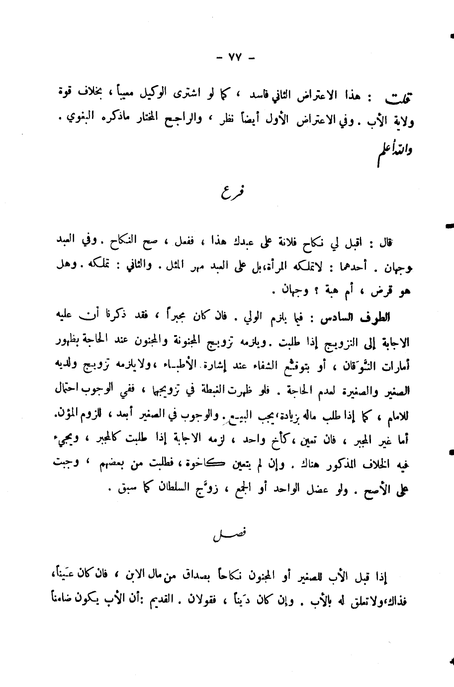 قُلْتُ: هَذَا الِاعْتِرَاضُ الثَّانِي فَاسِدٌ، كَمَا لَوِ اشْتَرَى الْوَكِيلُ مَعِيبًا، بِخِلَافِ قُوَّةِ وَلَايَةِ الْأَبِ. وَفِي الِاعْتِرَاضِ الْأَوَّلِ أَيْضًا نَظَرٌ، وَالرَّاجِحُ الْمُخْتَارُ مَا ذَكَرَهُ الْبَغَوِيُّ. - وَاللَّهُ أَعْلَمُ -.