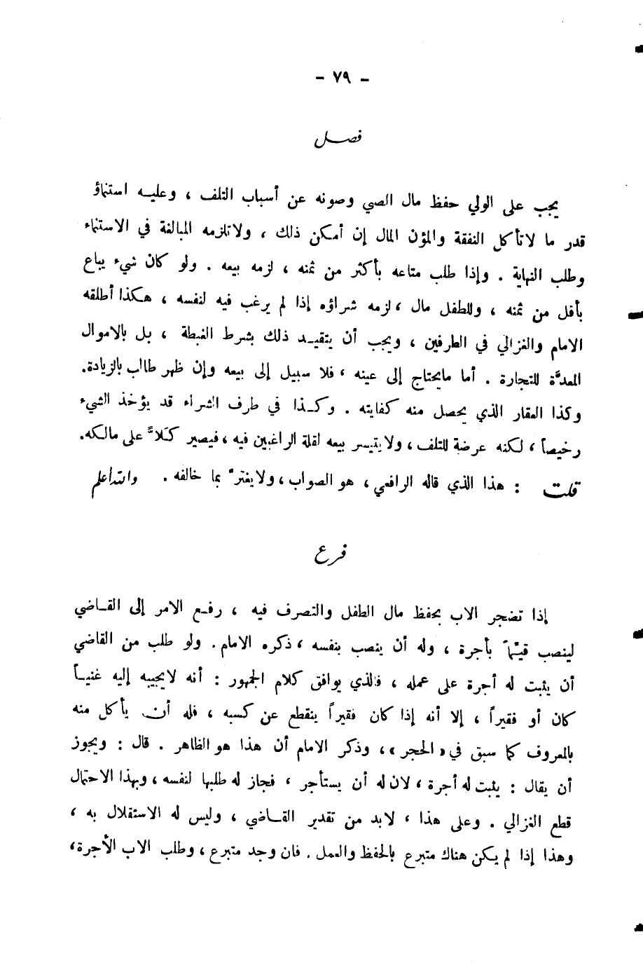 يَجِبُ عَلَى الْوَلِيِّ حِفْظُ مَالِ الصَّبِيِّ وَصَوْنُهُ عَنْ أَسْبَابِ التَّلَفِ، وَعَلَيْهِ اسْتِنْمَاءُ قَدْرِ مَا لَا تَأْكُلُ النَّفَقَةُ وَالْمُؤَنُ الْمَالَ إِنْ أَمْكَنَ ذَلِكَ، وَلَا تَلْزَمُهُ الْمُبَالَغَةُ فِي الِاسْتِنْمَاءِ وَطَلَبِ النِّهَايَةِ. وَإِذَا طُلِبَ مَتَاعُهُ بِأَكْثَرَ مِنْ ثَمَنِهِ، لَزِمَهُ بَيْعُهُ. وَلَوْ كَانَ شَيْءٌ يُبَاعُ بِأَقَلَّ مِنْ ثَمَنِهِ، وَلِلطِّفْلِ مَالٌ، لَزِمَهُ شِرَاؤُهُ إِذَا لَمْ يَرْغَبْ فِيهِ لِنَفْسِهِ، هَكَذَا أَطْلَقَهُ الْإِمَامُ وَالْغَزَالِيُّ فِي الطَّرَفَيْنِ، وَيَجِبُ أَنْ يَتَقَيَّدَ ذَلِكَ بِشَرْطِ الْغِبْطَةِ، بَلْ بِالْأَمْوَالِ الْمُعَدَّةِ لِلتِّجَارَةِ. أَمَّا مَا يَحْتَاجُ إِلَى عَيْنِهِ، فَلَا سَبِيلَ إِلَى بَيْعِهِ وَإِنْ ظَهَرَ طَالِبٌ بِالزِّيَادَةِ. وَكَذَا الْعَقَارُ الَّذِي يَحْصُلُ مِنْهُ كِفَايَتُهُ. وَكَذَا فِي طَرَفِ الشِّرَاءِ قَدْ يُؤْخَذُ الشَّيْءُ رَخِيصًا، لَكِنَّهُ عُرْضَةٌ لِلتَّلَفِ، وَلَا يَتَيَسَّرُ بَيْعُهُ لِقِلَّةِ الرَّاغِبِينَ فِيهِ، فَيَصِيرُ كَلًّا عَلَى مَالِكِهِ.