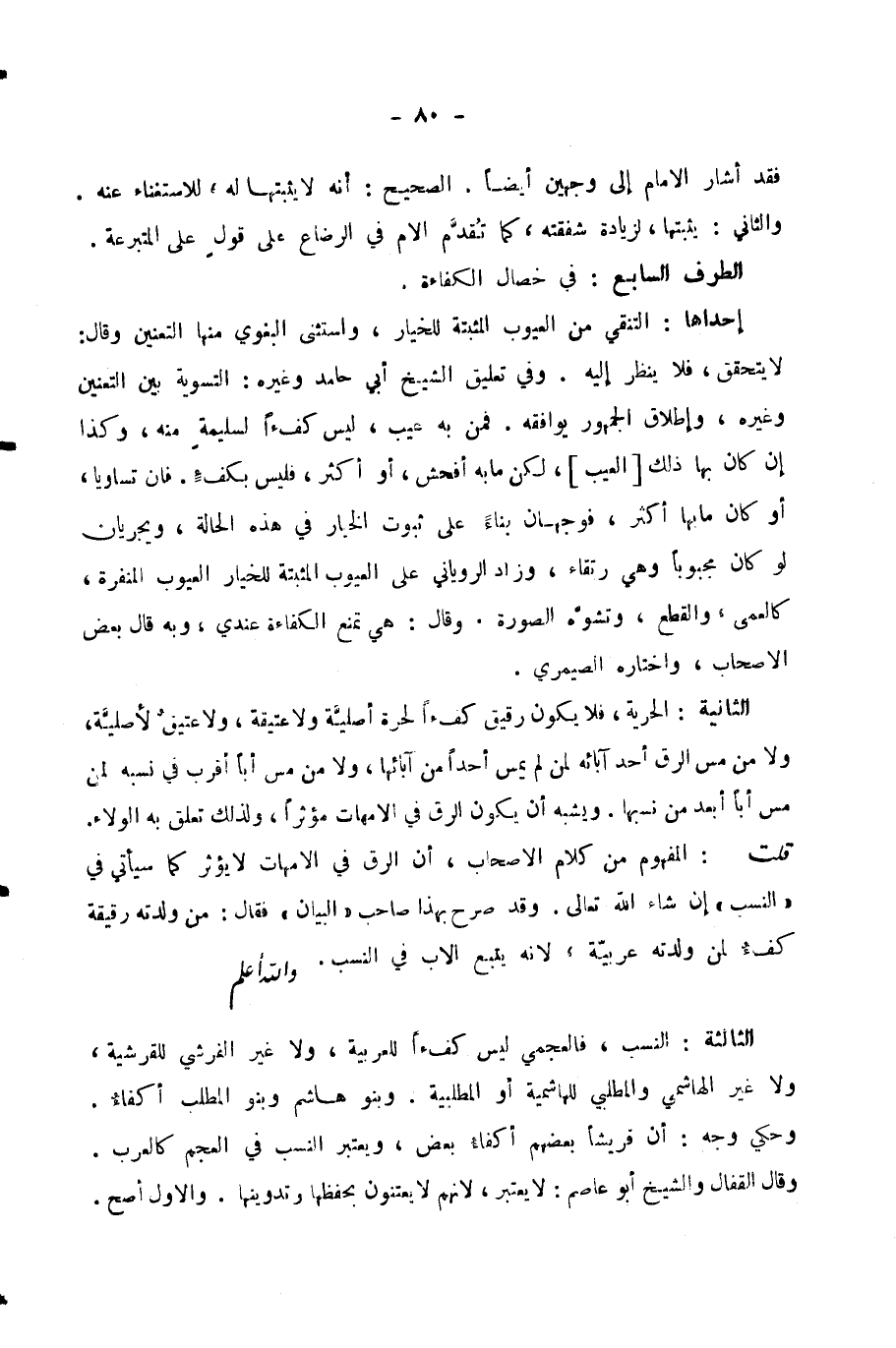 الثَّانِيَةُ: الْحُرِّيَّةُ، فَلَا يَكُونُ رَقِيقٌ كُفْئًا لِحُرَّةٍ أَصْلِيَّةٍ وَلَا عَتِيقَةٍ، وَلَا عَتِيقٌ لِأَصْلِيَّةٍ، وَلَا مَنْ مَسَّ الرِّقُّ أَحَدَ آبَائِهِ لِمَنْ لَمْ يَمَسَّ أَحَدًا مِنْ آبَائِهَا، وَلَا مَنْ مَسَّ أَبًا أَقْرَبَ فِي نَسَبِهِ لِمَنْ مَسَّ أَبًا أَبْعَدَ مِنْ نَسَبِهَا. وَيُشْبِهُ أَنْ يَكُونَ الرِّقُّ فِي الْأُمَّهَاتِ مُؤَثِّرًا، وَلِذَلِكَ تَعَلَّقَ بِهِ الْوَلَاءُ.