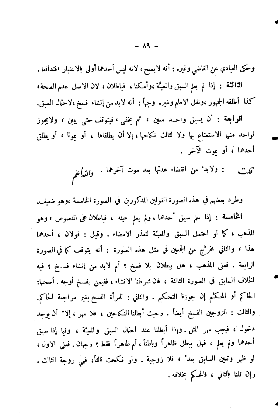 الْخَامِسَةُ: إِذَا عُلِمَ سَبْقُ أَحَدِهِمَا، وَلَمْ يُعْلَمْ عَيْنُهُ، فَبَاطِلَانِ عَلَى الْمَنْصُوصِ، وَهُوَ الْمَذْهَبُ، كَمَا لَوِ احْتَمَلَ السَّبْقُ وَالْمَعِيَّةُ لِتَعَذُّرِ الْإِمْضَاءِ. وَقِيلَ: قَوْلَانِ، أَحَدُهُمَا هَذَا، وَالثَّانِي مُخَرَّجٌ مِنَ الْجَمْعَيْنِ فِي مِثْلِ هَذِهِ الصُّورَةِ: أَنَّهُ يَتَوَقَّفُ كَمَا فِي الصُّورَةِ الرَّابِعَةِ. فَعَلَى الْمَذْهَبِ، هَلْ يَبْطُلَانِ بِلَا فَسْخٍ؟ أَمْ لَا بُدَّ مِنْ إِنْشَاءِ فَسْخٍ؟ فِيهِ الْخِلَافُ السَّابِقُ فِي الصُّورَةِ الثَّالِثَةِ، فَإِنْ شَرَطْنَا الْإِنْشَاءَ، فَفِيمَنْ يَفْسَخُ أَوْجُهٌ. أَصَحُّهَا: الْحَاكِمُ أَوِ الْمُحَكَّمُ إِنْ جَوَّزْنَا التَّحْكِيمَ. وَالثَّانِي: لِلْمَرْأَةِ الْفَسْخُ بِغَيْرِ مُرَاجَعَةِ الْحَاكِمِ. وَالثَّالِثُ: لِلزَّوْجَيْنِ الْفَسْخُ أَيْضًا. وَحَيْثُ أَبْطَلْنَا النِّكَاحَيْنِ، فَلَا مَهْرَ، إِلَّا أَنْ يُوجَدَ دُخُولٌ، فَيَجِبُ مَهْرُ الْمِثْلِ. وَإِذَا أَبْطَلْنَا عِنْدَ احْتِمَالِ السَّبْقِ وَالْمَعِيَّةِ، وَفِيمَا إِذَا سَبَقَ أَحَدُهُمَا وَلَمْ يُعْلَمْ، فَهَلْ يَبْطُلُ ظَاهِرًا وَبَاطِنًا، أَمْ ظَاهِرًا فَقَطْ؟ وَجْهَانِ. فَعَلَى الْأَوَّلِ، لَوْ ظَهَرَ وَتَعَيَّنَ السَّابِقُ بَعْدُ، فَلَا زَوْجِيَّةَ. وَلَوْ نَكَحَتْ ثَالِثًا، فَهِيَ زَوْجَةُ الثَّالِثِ. وَإِنْ قُلْنَا بِالثَّانِي، فَالْحُكْمُ بِخِلَافِهِ.