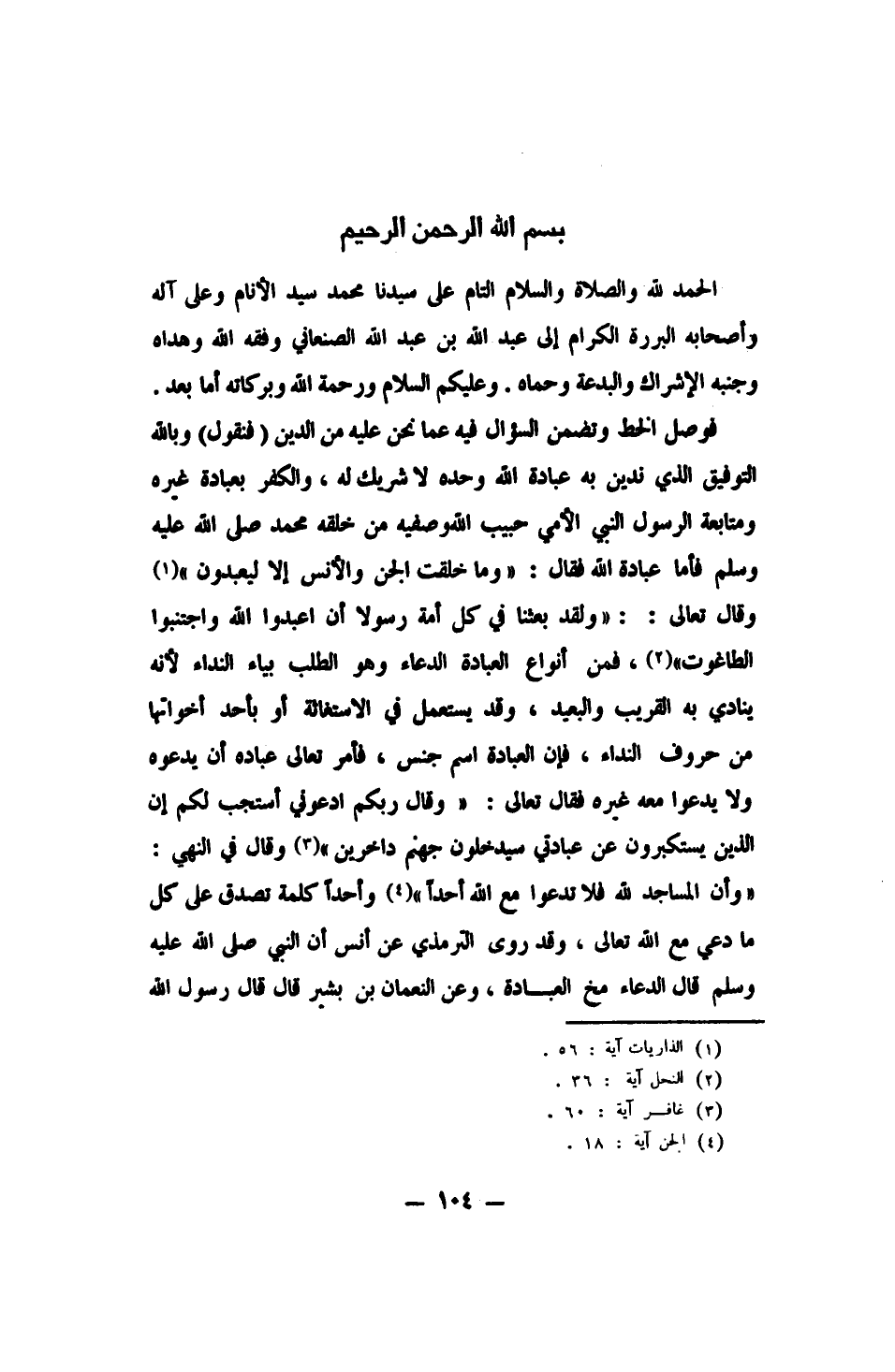 فأما عبادة الله فقال: {وَمَا خَلَقْتُ الْجِنَّ وَالأِنْسَ إِلاَّ لِيَعْبُدُونِ} 1، وقال تعالى: {وَلَقَدْ بَعَثْنَا فِي كُلِّ أُمَّةٍ رَسُولاً أَنِ اعْبُدُوا اللَّهَ وَاجْتَنِبُوا الطَّاغُوتَ} 2. فمن أنواع العبادة: الدعاء: وهو الطلب بياء النداء، لأنه ينادى به القريب والبعيد، وقد يستعمل في الاستغاثة، أو بأحد أخواتها من حروف النداء. فإن العبادة اسم جنس، فأمر تعالى عباده أن يدعوه ولا يدعوا معه غيره، فقال تعالى: {وَقَالَ رَبُّكُمُ ادْعُونِي أَسْتَجِبْ لَكُمْ إِنَّ الَّذِينَ يَسْتَكْبِرُونَ عَنْ عِبَادَتِي سَيَدْخُلُونَ جَهَنَّمَ دَاخِرِينَ} 3.