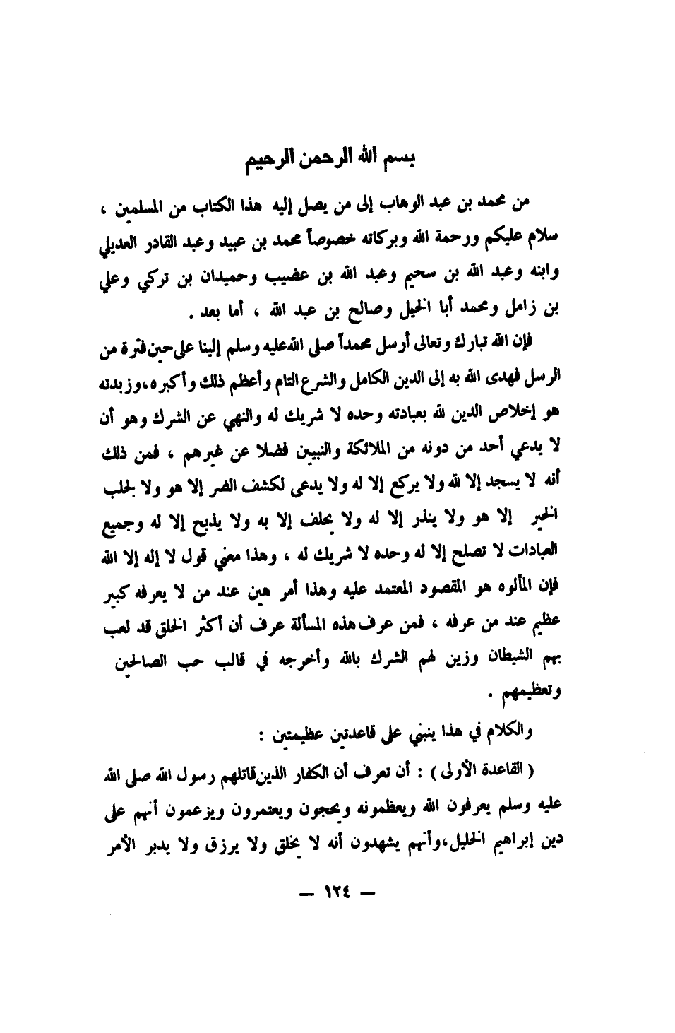 من محمد بن عبد الوهاب، إلى من يصل إليه هذا الكتاب من المسلمين، سلام عليكم ورحمة الله وبركاته، خصوصاً محمد بن عبيد، وعبد القادر العديلي وابنه، وعبد الله بن سحيم، وعبد الله بن عضيب، وحميدان بن تركي، وعلي بن زامل، ومحمد أبا الخيل، وصالح بن عبد الله.