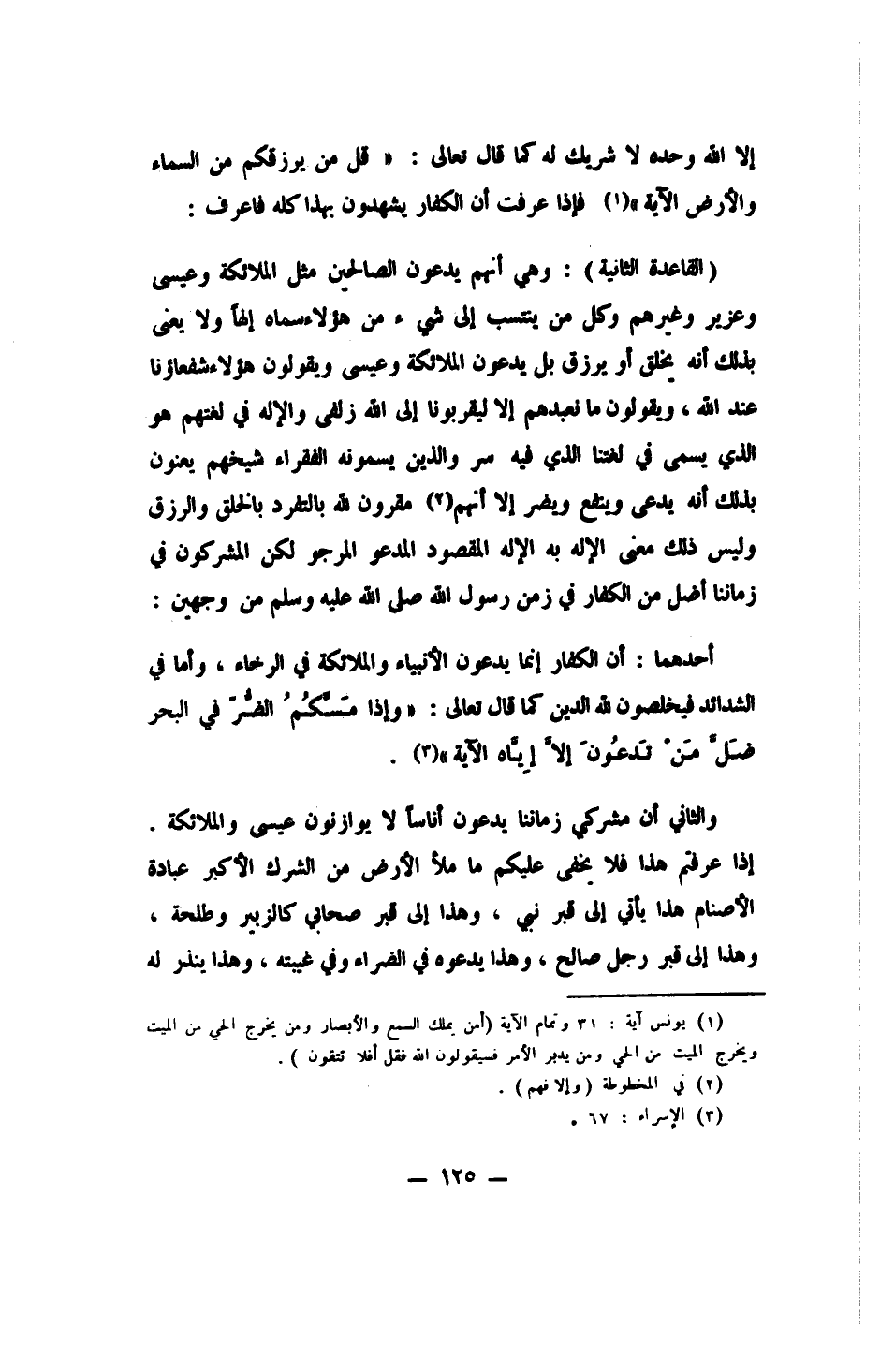 القاعدة الثانية: وهي أنهم يدعون الصالحين، مثل الملائكة وعيسى وعزير وغيرهم، وكل من ينتسب إلى شيء من هؤلاء سماه إلهاً، ولا يعني بذلك أنه يخلق أو يرزق، بل يدعون الملائكة وعيسى ويقولون: هؤلاء شفعاؤنا عند الله، ويقولون ما نعبدهم إلا ليقربونا إلى الله زلفى، والإله في لغتهم هو الذي يسمى في لغتنا: الذي فيه سر، والذين يسمونه الفقراء شيخهم، يعنون بذلك أنه يُدعى وينفع ويضر، إلا أنهم 2 مقرّون لله بالتفرد بالخلق والرزق. وليس ذلك معنى الإله بل الإله المقصود المدعو المرجو، لكن المشركون في زماننا أضل من الكفار في زمن رسول الله صلى الله عليه وسلم من وجهين: