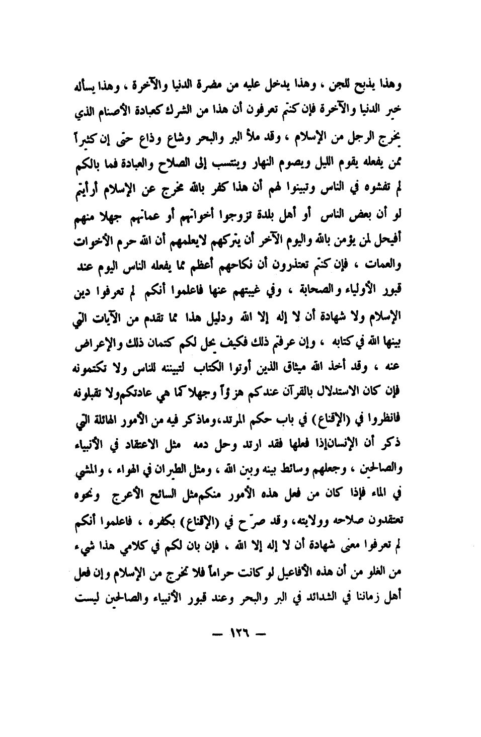 فإن كان الاستدلال بالقرآن عندكم هزؤاً وجهلاً كما هي عادتكم ولا تقبلونه، فانظروا في "الإقناع" في باب حكم المرتد، وما ذكر فيه من الأمور الهائلة التي ذكر أن الإنسان إذا فعلها فقد ارتد وحل دمه، مثل الاعتقاد في الأنبياء والصالحين، وجعلهم وسائط بينه وبين الله، ومثل الطيران في الهواء، والمشي في الماء. فإذا كان من فعل هذه الأمور منكم مثل السائح الأعرج ونحوه تعتقدون صلاحه وولايته، وقد صرح في الإقناع بكفره، فاعلموا أنكم لم تعرفوا معنى شهادة أن لا إله إلا الله. فإن بان لكم في كلامي هذا شيء من الغلو، من أن هذه الأفاعيل لو كانت حراماً فلا تخرج من الإسلام، وأن فعل أهل زماننا في الشدائد في البر والبحر وعند قبور الأنبياء والصالحين